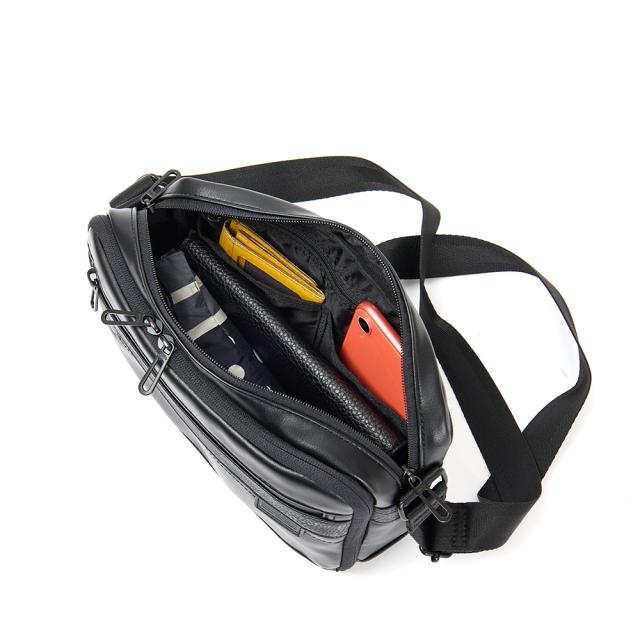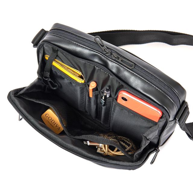 ・前胴ファスナーポケットは全開するとマチがついており、大きく開く事で小物の収納、出し入れや、仕分けをしやすい設計になっております。キーフックもついており鍵の紛失防止などにも役立ちます。背面にはマグネットホックのついたオープンポケットも完備、取り出し頻度の高い携帯品の収納に便利です。