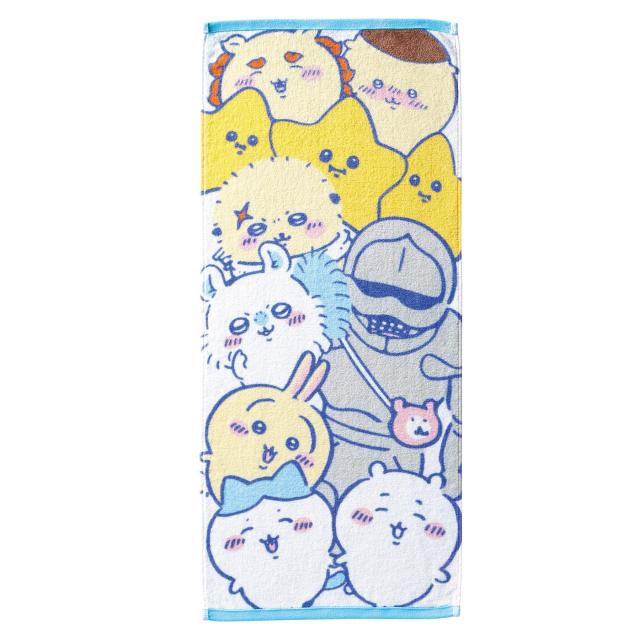 ちいかわのキャラクターが集合! 綿100%なので肌触り柔らか、吸水率も満足な、使い勝手の良いタオルです。