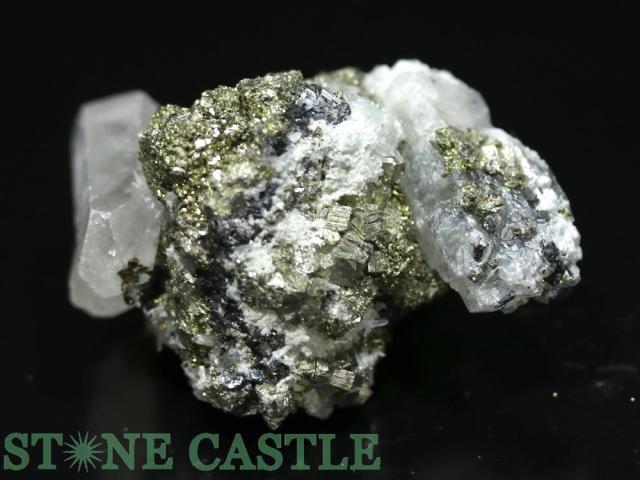 パイライトと細く透明感がある水晶の共生クラスターです。パイライトの断面の金色が美しく輝きます。