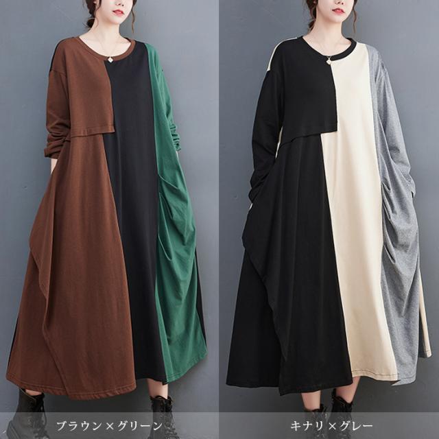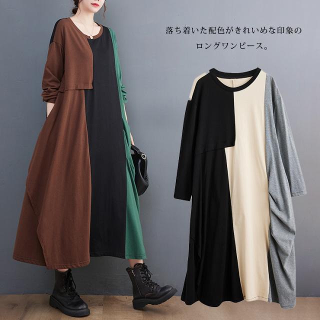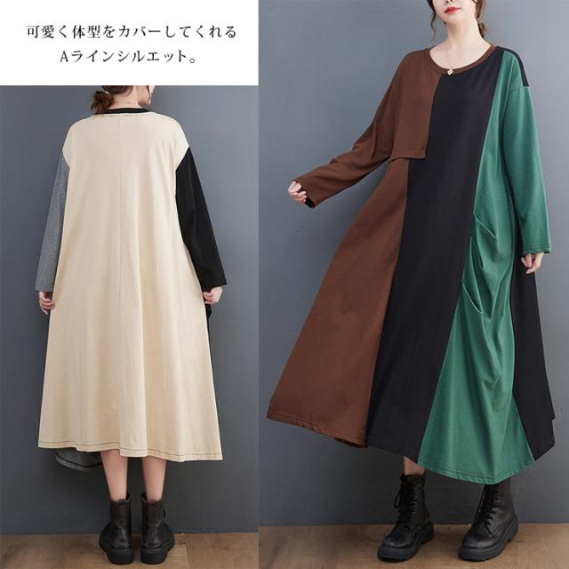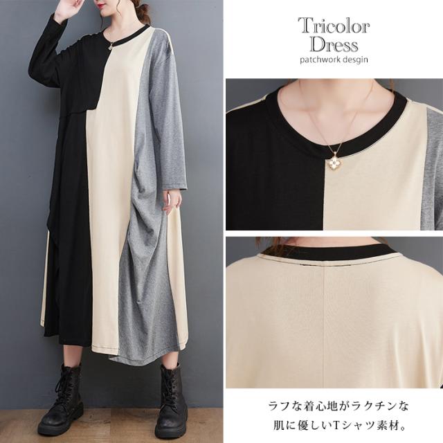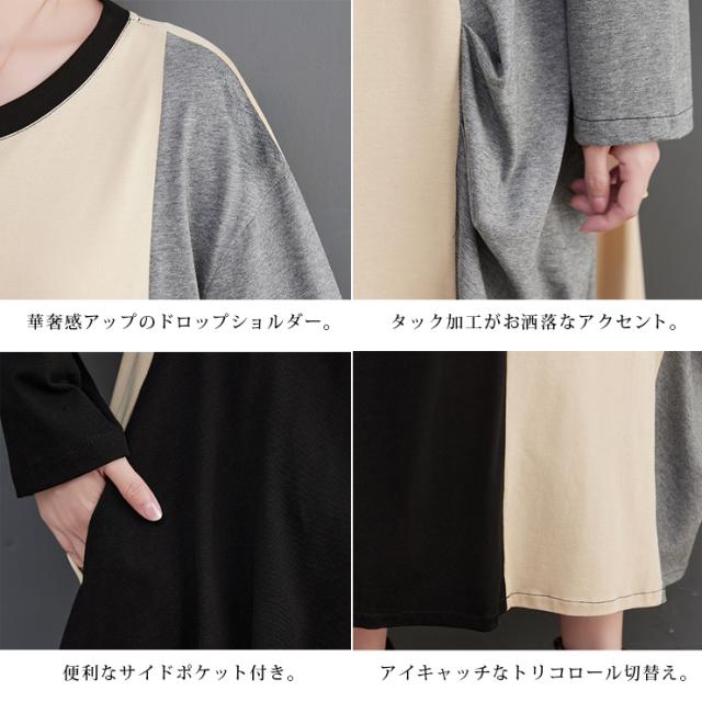 大きいサイズ レディース 切り替えワンピース 長袖 トリプルカラー Tシャツワンピ バイカラー 春 秋 (519600)