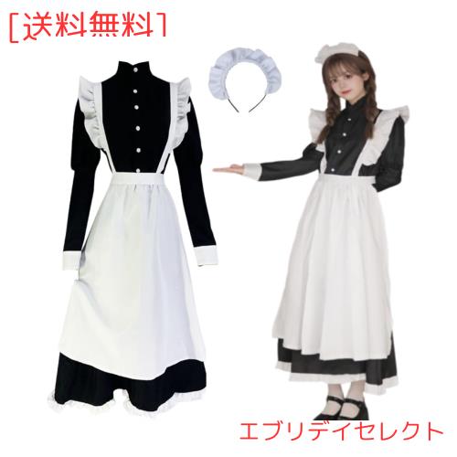 [FULINE] メイド服 ロングスカート 英国風 コスプレ衣装 長袖 レディースエプロン ドレス コスチューム 仮装 女装 学園祭 ブラック S