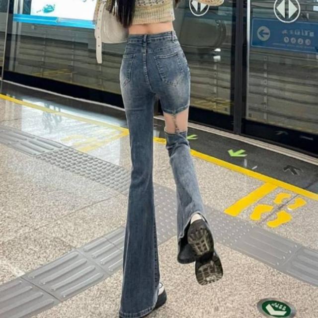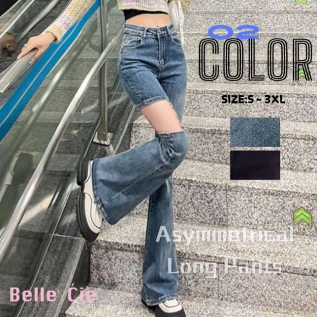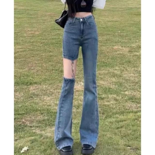 デニムパンツ アシメ スリット 肌見せ セクシー ブーツカット レディース 韓国ファッション ロングパンツ 大きいサイズ XXL XXXL ガーター