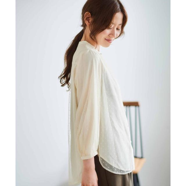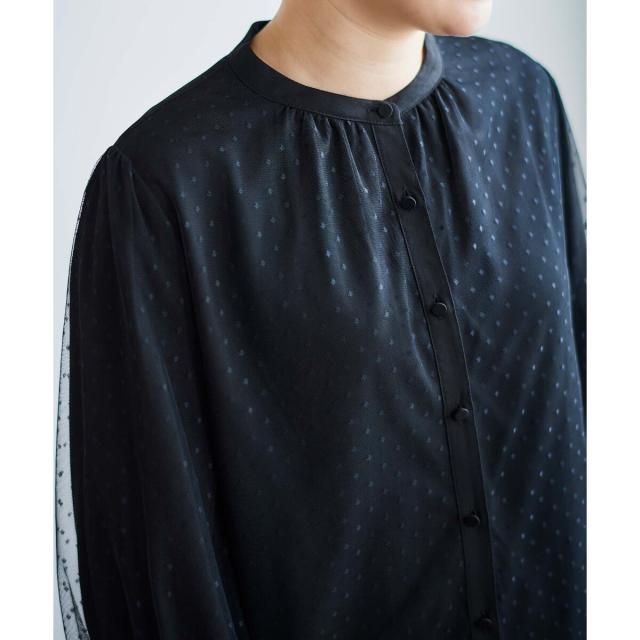 女性らしさを引き立てるドットチュールをバンドカラーと裾のデザインをシャツっぽく仕上げているので、程よい甘さに仕上げた1枚です。