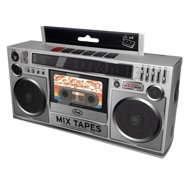 懐かしいラジカセ風外箱に入ったミュージックテープ型スポンジ