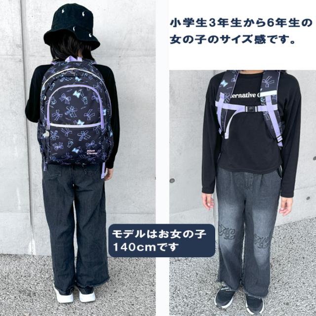 【特徴】大人気NICE CLAUPの『マロンシリーズ』からキュートなジュニアリュックが登場。 散りばめられた手書き風のネコとリボンの絵柄がかわいいデザインで、おしゃれに興味を持ち出す女の子にオススメです。 小学校中学年〜小学校高学年向けの20Lサイズ。 A4サイズ対応の使いやすいサイズ感で、通学・遠足、お出かけや習い事など様々なシーンで大活躍してくれます♪ サイドにポケット、フロントにもファスナーポケット搭載で整理整頓はばっちり。 荷物のズレを抑えるチェストベルトつきで、沢山動き回っても安心です。