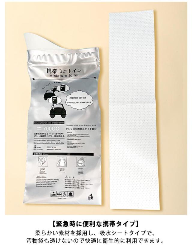 | おしっこを固めて、においを消す!700mlたっぷり吸収!携帯ミニトイレ10枚セット 【緊急時に便利な携帯タイプ】:柔らかい素材を採用し、吸水シートタイプで、汚物袋も透けないので快適に衛生的に利用できます。 【700mlの吸収力・安全安心】:吸水性抜群!一般的な成人の排尿量は200~400mIですので最大700mlを吸水してくれる本商品は安心設計です。 【男女問わず子どもOK】:携帯ミニトイレは開口部が大きく開くから、コンパクトで使いやすく男女問わず誰でもご使用になれます。 【コンパクトで持ち運びに便利】:片手で使用可能。ワンタッチで簡単に使用できま・コンパクトで便利!余ったスペースに収納できます。 【消臭力、抗菌に優れて安心】:ポリエチレンと吸水ポリマーを使用する赤ちゃん用のおむつのような吸収シートを採用し、素早くゲル状に排泄物を固めて匂いも抑えられて、消臭力、抗菌に優れて、安心できます。 【密閉型デザイン】携帯ミニトイレをご使用後、袋のジッパーをしっかり閉める。すぐ捨てることができなくても臭わず快適!菌も漏らさず衛生的です。 【サクッと!済ませる】:車での渋滞時やレジャーにも欠かせない簡易トイレ介護や災害での断水、トイレの故障などの際にも。乗り物酔いなど旅行やビジネスの移動中にあれば便利。手軽に持ち運びができて安心してお出かけできます。 | |