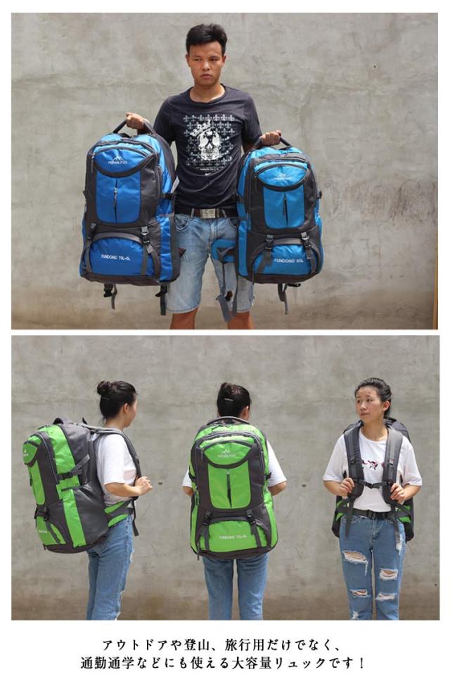 | 撥水加工の大容量のアウトドアリュック。 ポケットがたくさんあり、衣類・靴及び他のお出かけ用品を収納でき、登山や旅行に最適。 背中部分はメッシュ素材を使用しており、滑りにくく背負う過程で肩に発生する空滑り現象を防止します。 ワイドショルダー+ストレスパッド+胸(腰)固定ベルトで背負いやすくなります。 アウトドアや登山、旅行用だけでなく、通勤通学などにも使える大容量リュックです! | |