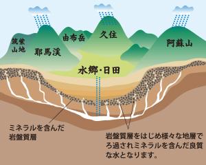 ![]() | 日田盆地を取り囲む山々に降り注いだ雨は、複雑に何層にも積み重なった天然のフィルターである地層を潜りろ過され、やがてこの日田の地へとたどり着きます。その中でも、更に限られた場所から採水されるのが日田天領水です。 その原水はもともとうなぎなどの淡水魚を洋食する目的で汲み上げられていた深井戸水。うなぎの成育が良いだけではなく、特に滅菌処理をしなくてもミネラルウォーターの基準をクリアするほど良質な原水は、天然のミネラルバランスを保った飲みやすくおいしい軟水で、自然にpH約8.3に保たれた弱アルカリ性でもあります。 |
