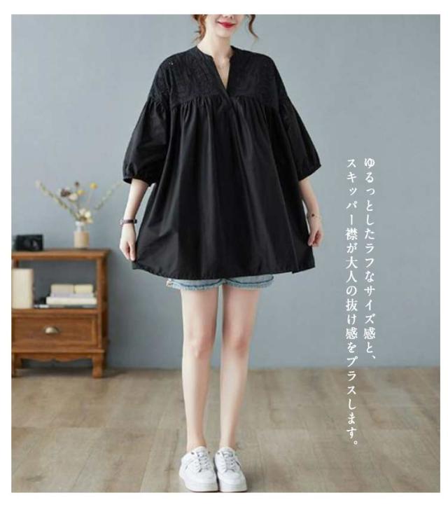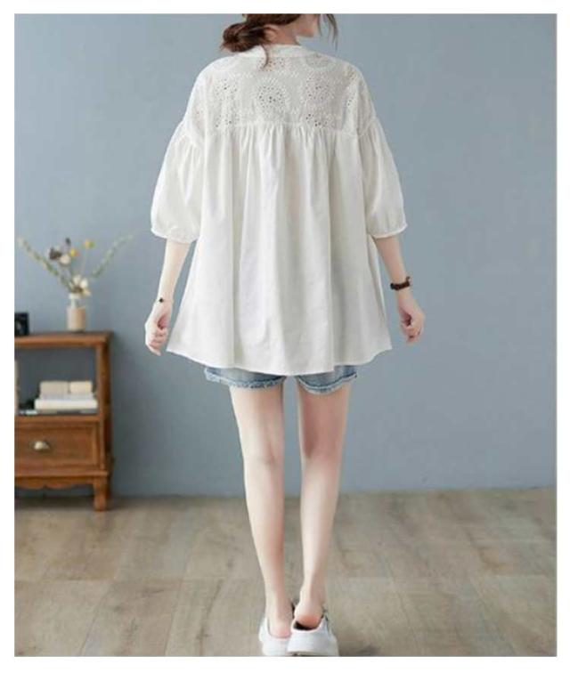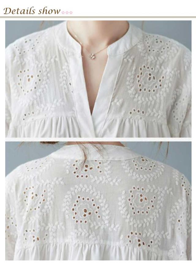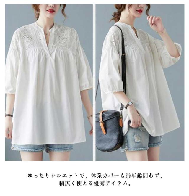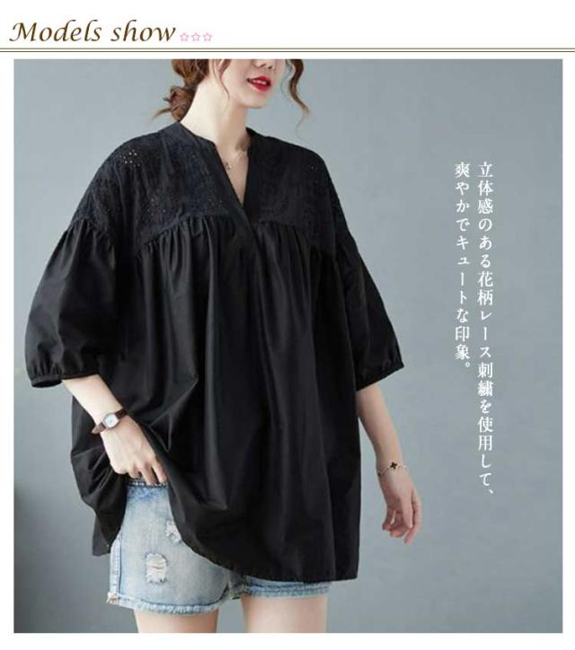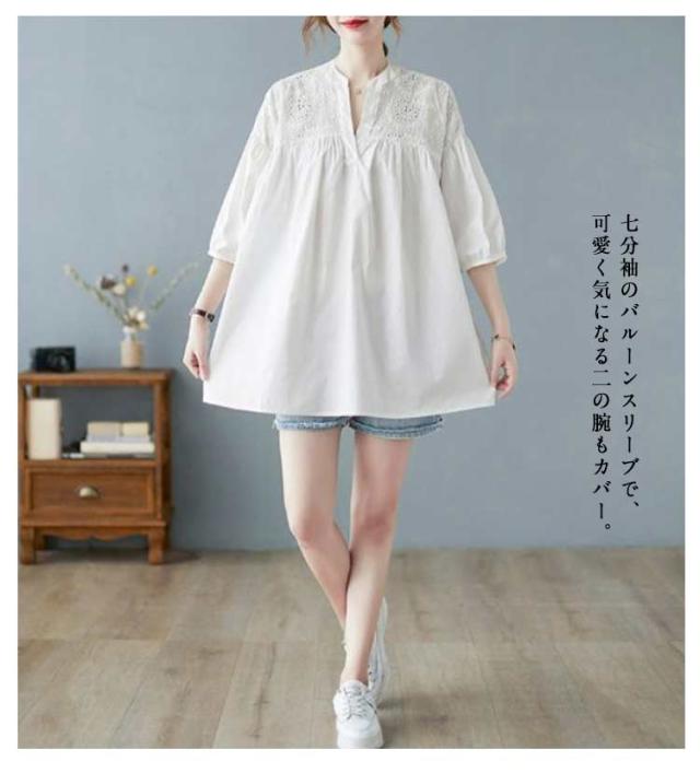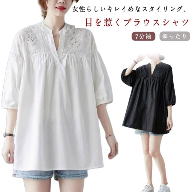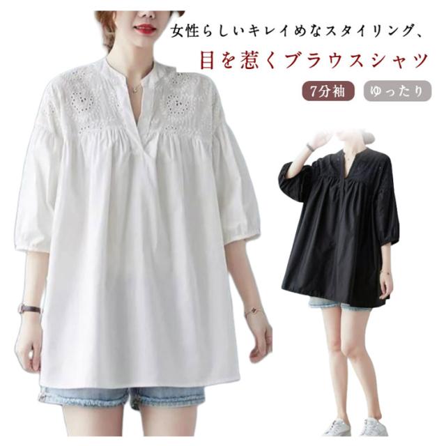 シャツ レディース 花柄モチーフ 大人可愛い トップス ブラウス ゆったり 体型カバー シャツブラウス 涼しい ブラウス おしゃれ オーバーシャツ 7分袖 ボリューム ブラウス レース 花柄レース 薄手 ボリューム 春夏 無地 シンプル ギフト