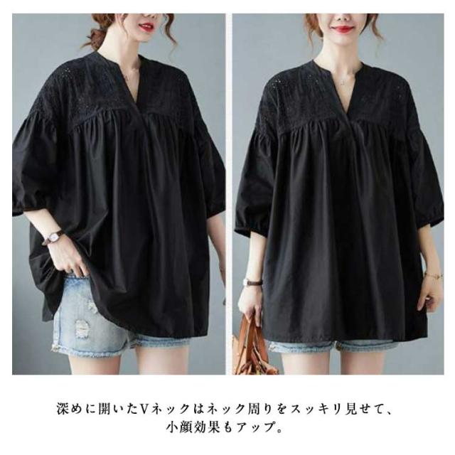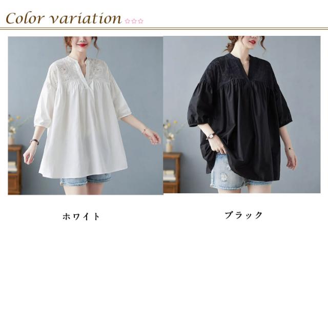 | 女性らしいキレイめなスタイリング、目を惹くブラウスシャツ 立体感のある花柄レース刺繍を使用して、爽やかでキュートな印象。 ゆるっとしたラフなサイズ感と、スキッパー襟が大人の抜け感をプラスします。 深めに開いたVネックはネック周りをスッキリ見せて、小顔効果もアップ。 七分袖のバルーンスリーブで、可愛く気になる二の腕もカバー。 ゆったりシルエットで、体系カバーも◎年齢問わず、幅広く使える優秀アイテム。 | |