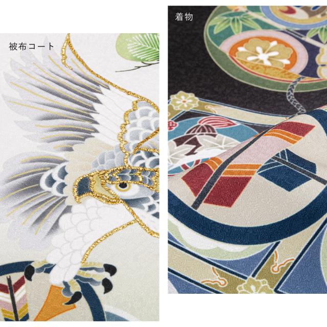 被布コートは紬調のシンプルな無地のデザインで、着物は花々が映える束ね熨斗などのモダンな和柄のデザインです。