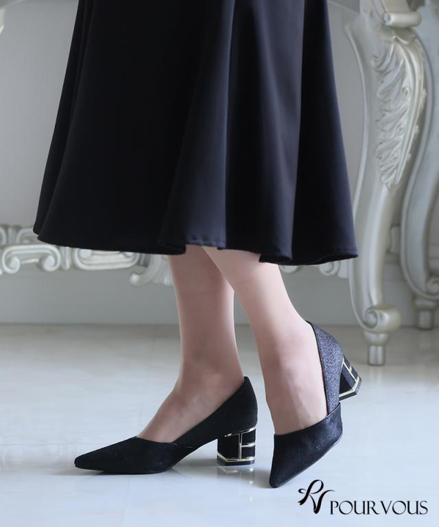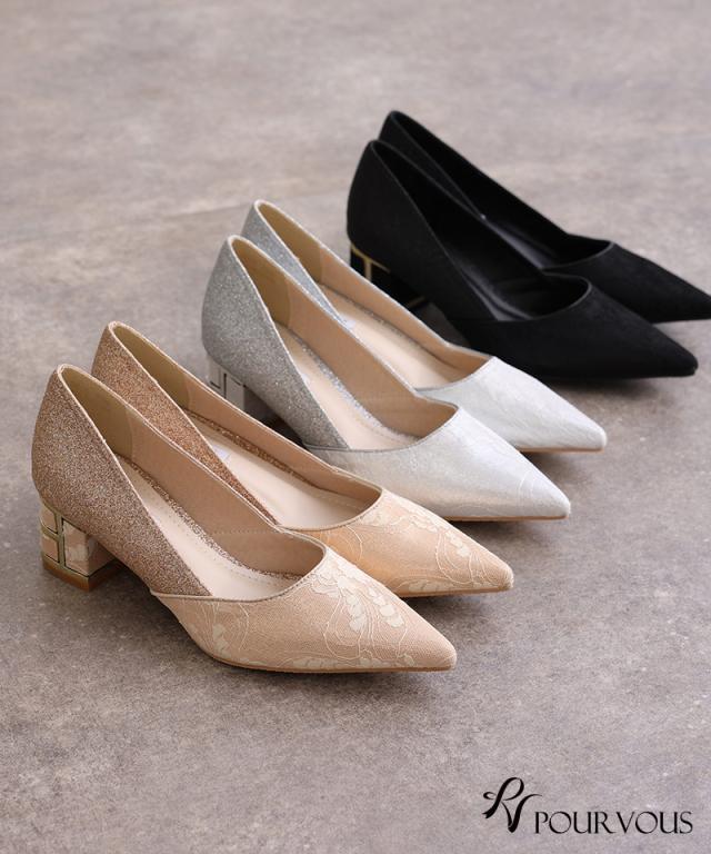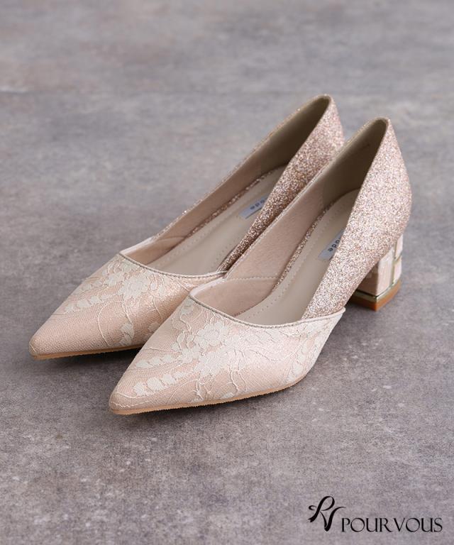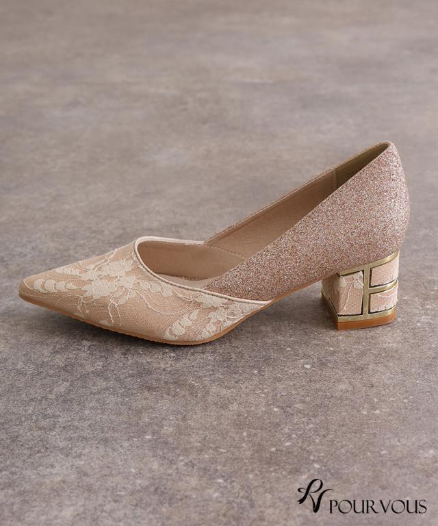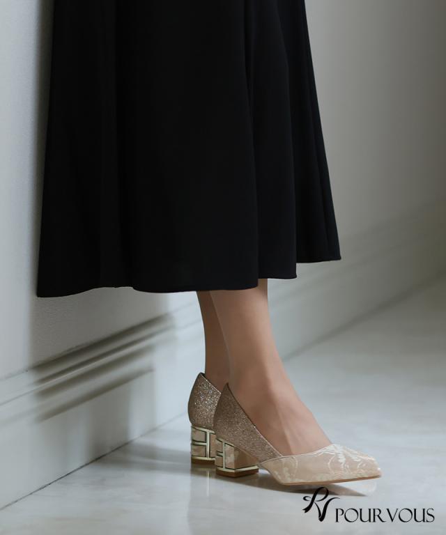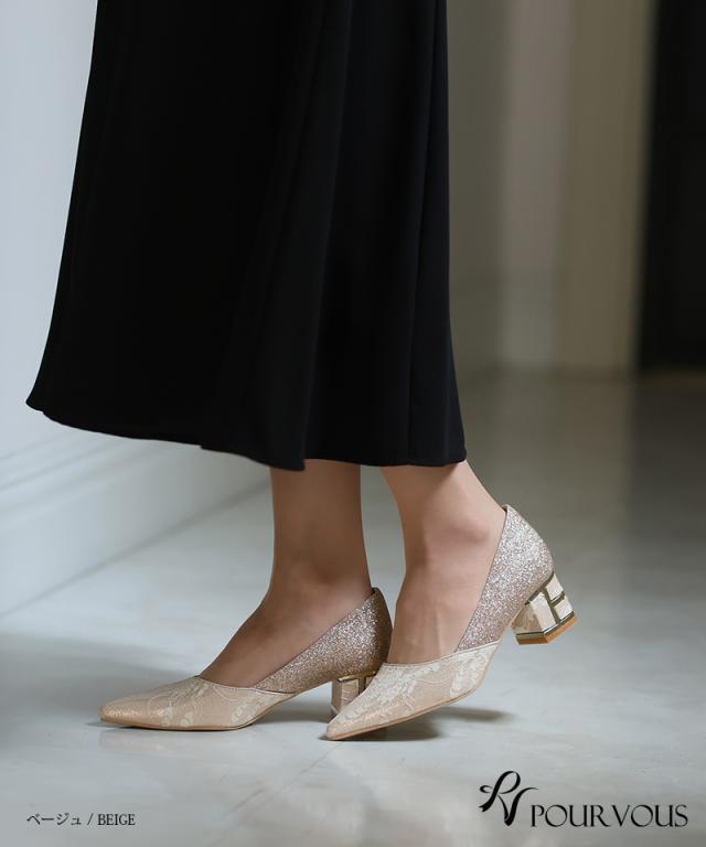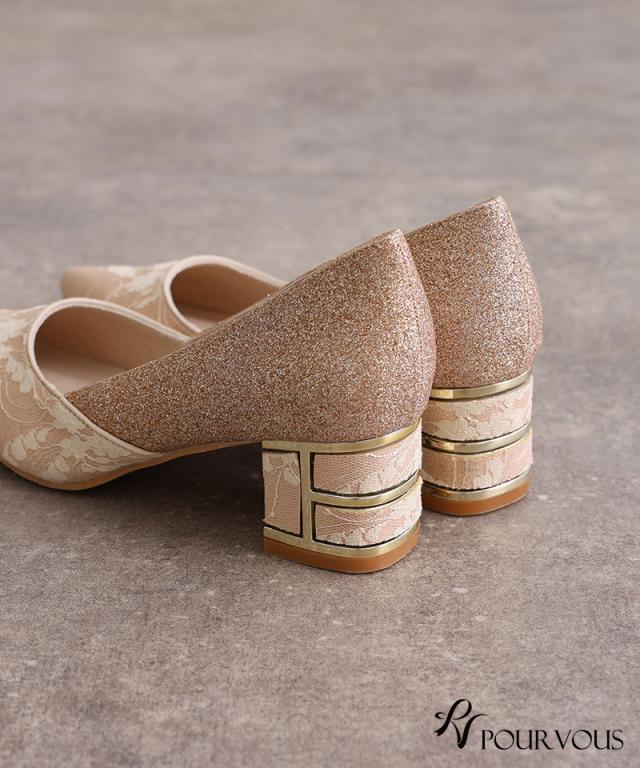 レース×グリッターチャンキーヒール【153241522】20代・30代・40代・50代・パーティーシューズ・痛くないパンプス・ローヒール・太ヒール・ピンヒール・ヒール・レース・ラメ・デザインヒール・フォーマル・大きいサイズなど・即日発送・送料無料・結婚式・婚活・披露宴・顔合わせ・二次会・同窓会・お呼ばれ・食事会・謝恩会・親族・七五三・お宮参り・冠婚葬祭・弔事・女子会・デート・入学式・卒業式・入園式・卒園式・ママ・マタニティー・セレモニー・セレブ・パーティー