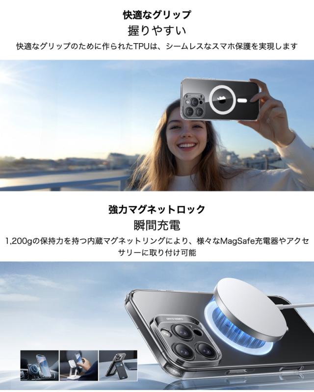 【互換性】スピーカーとポートの精密カットアウト、超薄型デザイン、イージープレスボタンにより、機能性を完全に維持します。【より強力な磁気ロック】1,200gの保持力を持つ強力な磁気吸着リングは、MagSafeと互換性があり、より速く、より簡単な瞬間吸着ワイヤレス充電を実現させ、あらゆるMagSafeアクセサリーとの安全な磁気吸着ロックを可能にします。【軍事規格の保護力】衝撃を吸収するエアガードコーナーとカメラガード(0.7 mm)を備えた盛り上がったエッジ(1.2 mm)が、落下、衝撃、傷から保護します。【超薄型・軽量】洗練されたデザインが快適グリップを可能にし、柔軟のポリマーにより着脱を容易に行えます。【オリジナルを維持】厚さわずか1.22mmの防傷性の透明ポリマーが、iPhone 16 Pro のなめらかな本来の外観と手触りを維持します。対応機種・iPhone 16・iPhone 16 Plus・iPhone 16 Pro・iPhone 16 Pro MAX