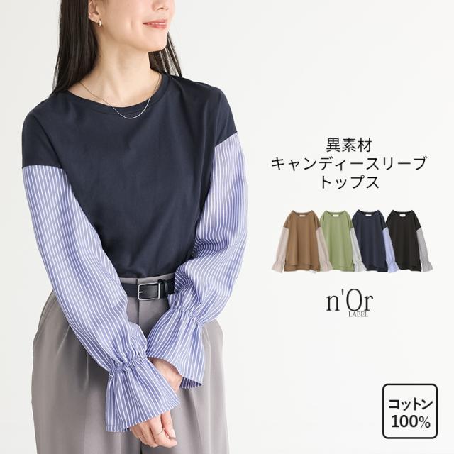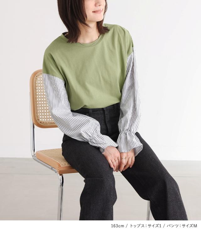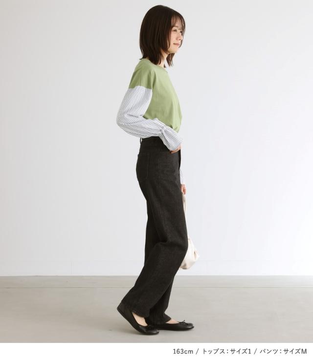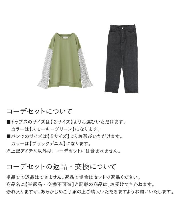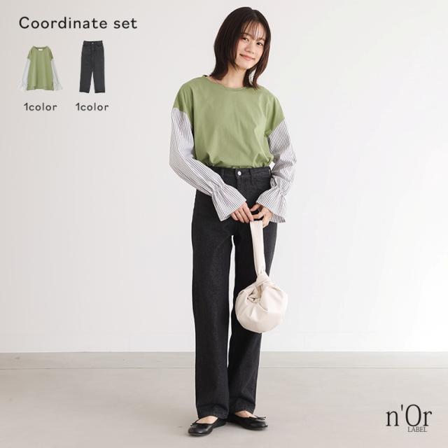 『異素材キャンディースリーブカットソー×ストレートデニムパンツコーデ2点SET』【メール便不可】【30】[2点コーデセット 2024 レディース カットソー トップス 長袖 ロンT ブラウス デニム パンツ ジーンズ]