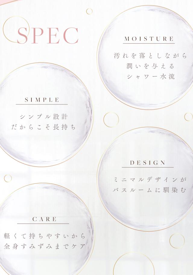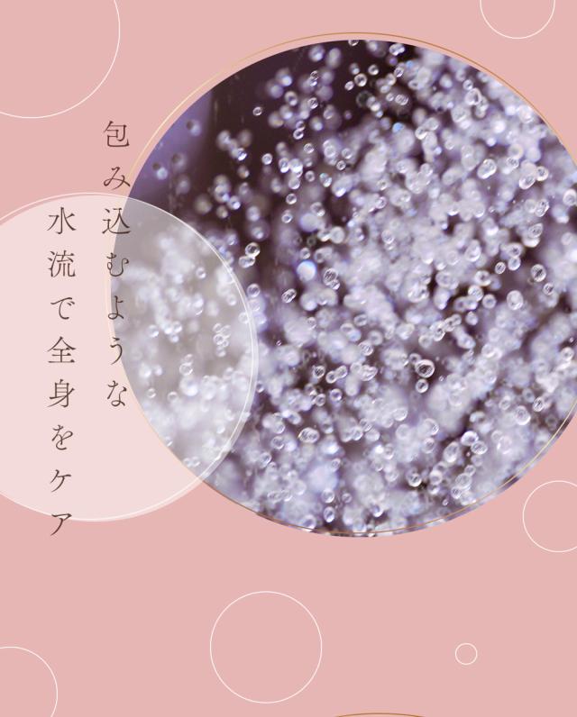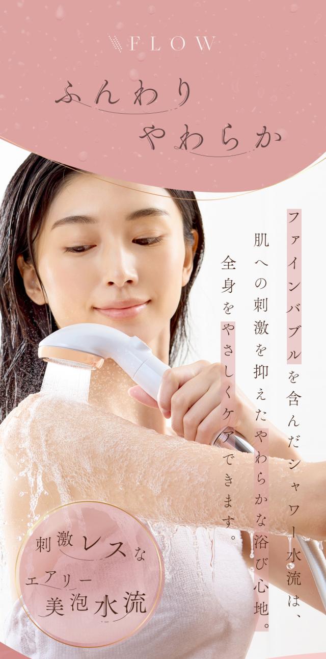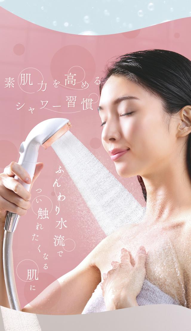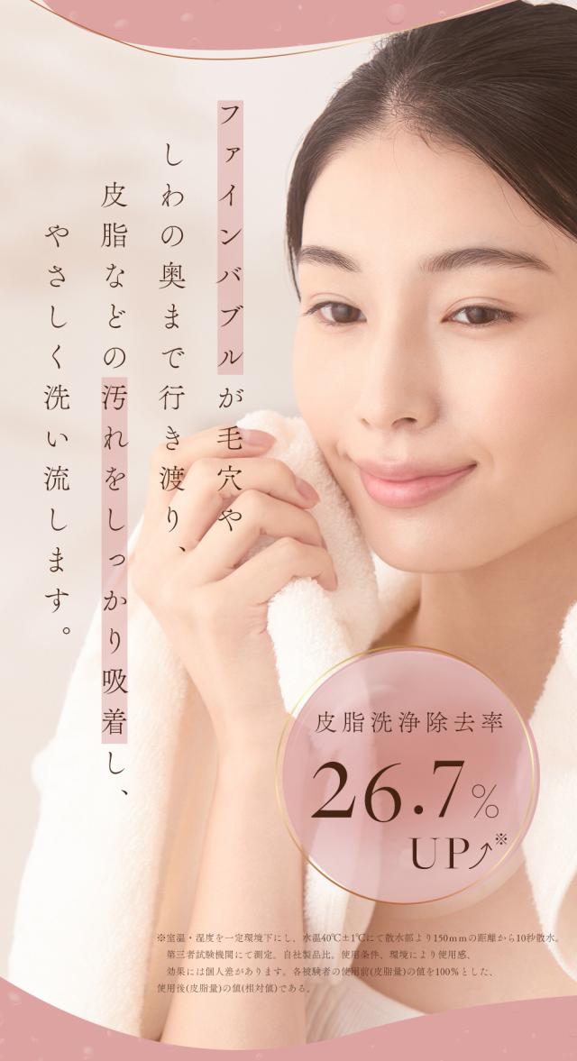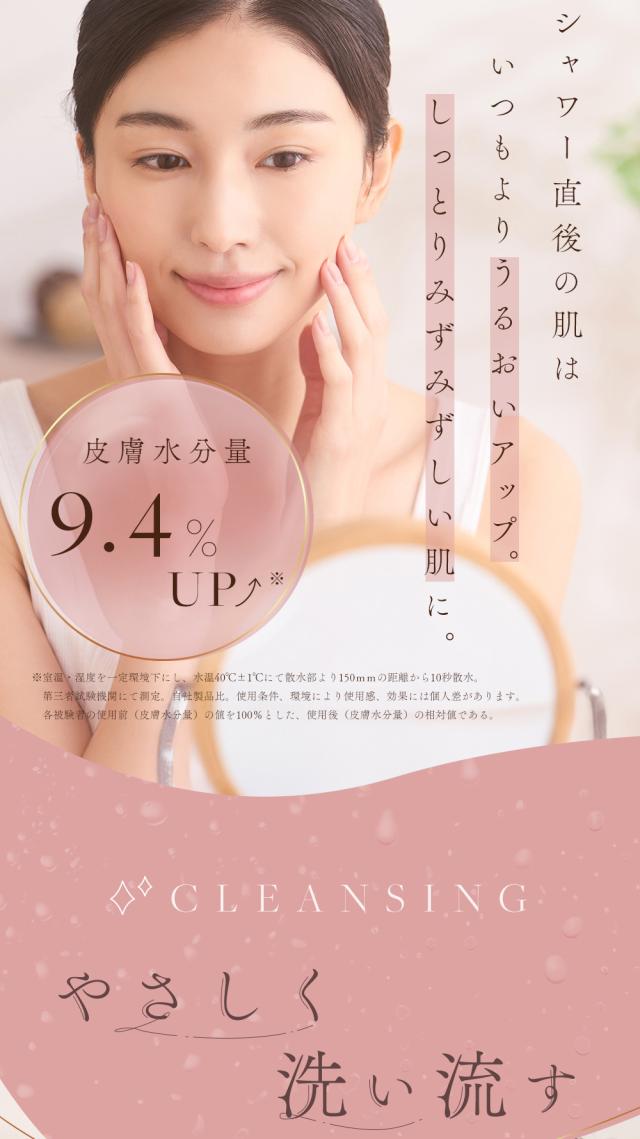 毎日のシャワーで、心地よく潤い、満たす。潤いに満ちた肌へ、水分量9.4%アップ。すみずみまでクリアに、皮脂洗浄除去率26.7アップ。肌の事を考える微細気泡を含んだふんわり水流。
