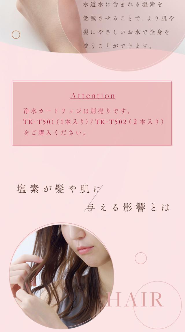 | 浄水カートリッジ(別売り) | 別売りの浄水カートリッジをご使用いただくことで、水道水に含まれる残留塩素を低減させることができます。 塩素の低減能力を保つためには、カートリッジの定期的な交換が必要になります。 別売シャワーヘッド用浄水カートリッジ 品番:TK-T501(1本)、TK-T502(2本入) |