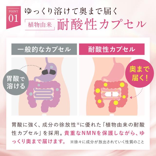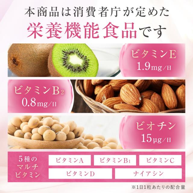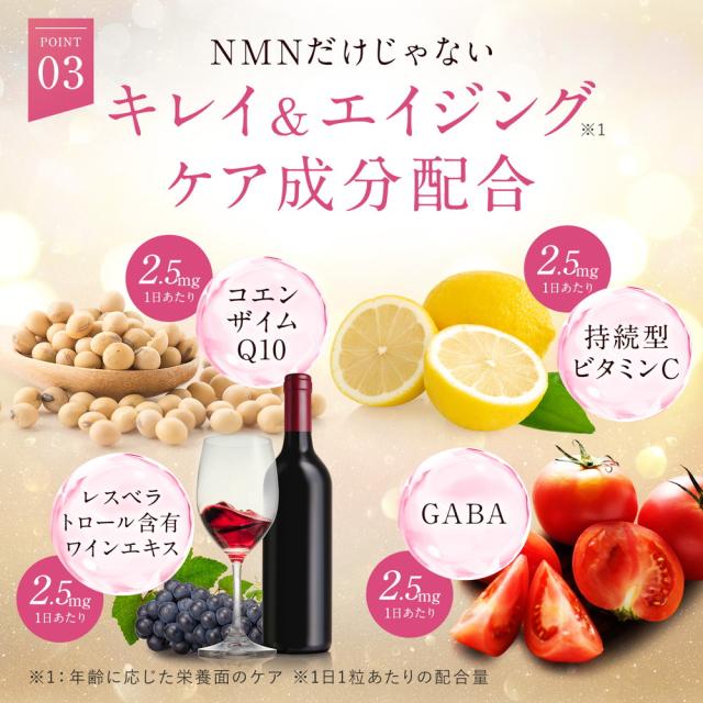 また、NMN以外にも、コエンザイムQ10やレスベラトロール、GABA、持続型ビタミンC、ビオチン、マルチビタミンなどのキレイ&エイジングケア成分を配合しています。