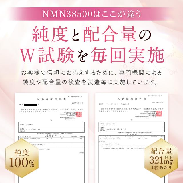 さらに、厚生労働省登録の第三者機関で製造毎にNMNの純度と配合量の試験を実施し、合格したものだけをお届けしています。