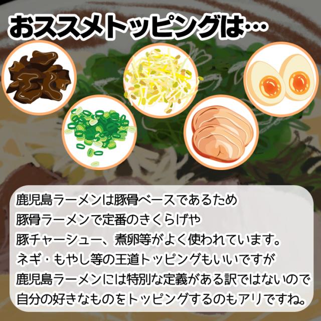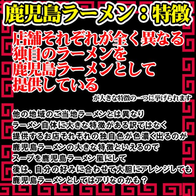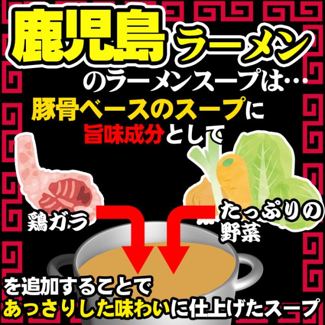 | 原材料名 | ■讃岐生太中華麺:小麦粉(国内製造)、食塩/かんすい、焼成カルシウム、酒精、クチナシ色素、加工デンプン ■鹿児島ラーメンスープ:ポークエキス(国内製造)、醤油、調整ラード、鰹節エキス、食塩、にんにく、砂糖、食用植物油、オニオンパウダー、チキン油、コショウ、生姜、調味料(アミノ酸等)、増粘剤(キサンタンガム)、(一部に小麦・乳成分を含む) |