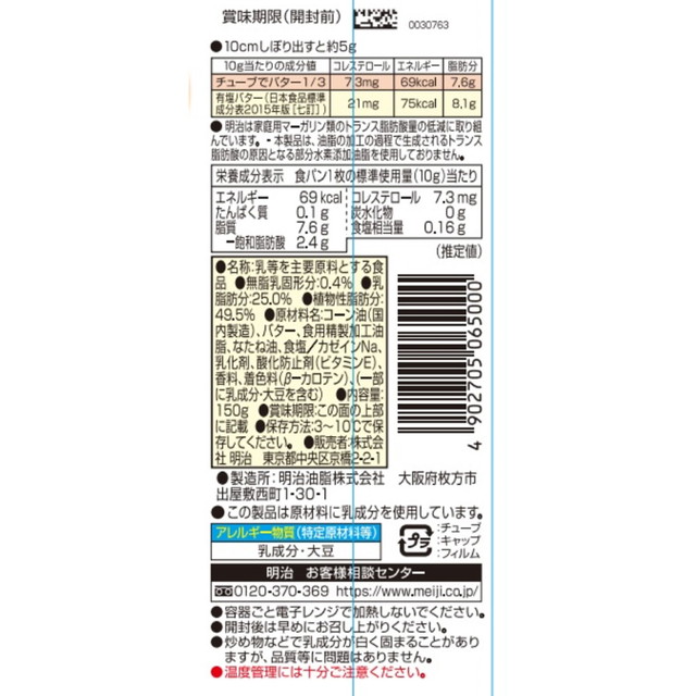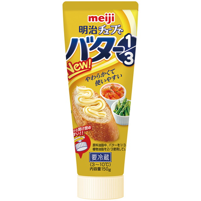 商品名 明治 チューブでバター1/3 150g×3個 容量 150g×3個 原材料名 コーン油(国内製造)、バター、食用精製加工油脂、なたね油、食塩、カゼインNa、乳化剤、酸化防止剤(ビタミンE)、香料、着色料(β−カロテン)、(一部に乳成分・大豆を含む) アレルギー特定原材料 乳 賞味期限 商品の発送時点で、30日以上あるものをお届けいたします 保存方法 3〜10℃で保存してください。