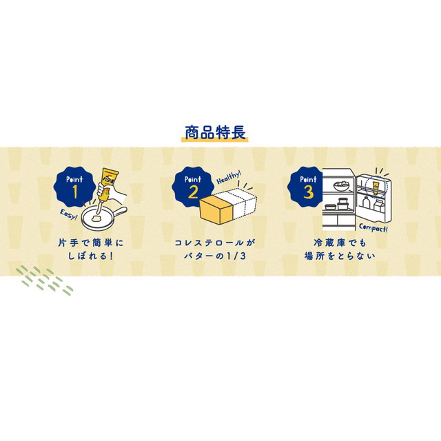 バターを製品中1/3使用しているので、バターのコクのあるおいしさを楽しむことが出来ます。便利なチューブタイプなので、手を汚さずに使用することができます。冷蔵庫内での臭い移りの心配がなく、保存性に優れています。バターより柔らかいので絞りやすく、片手で使えて包丁を使わずに使用することができます。