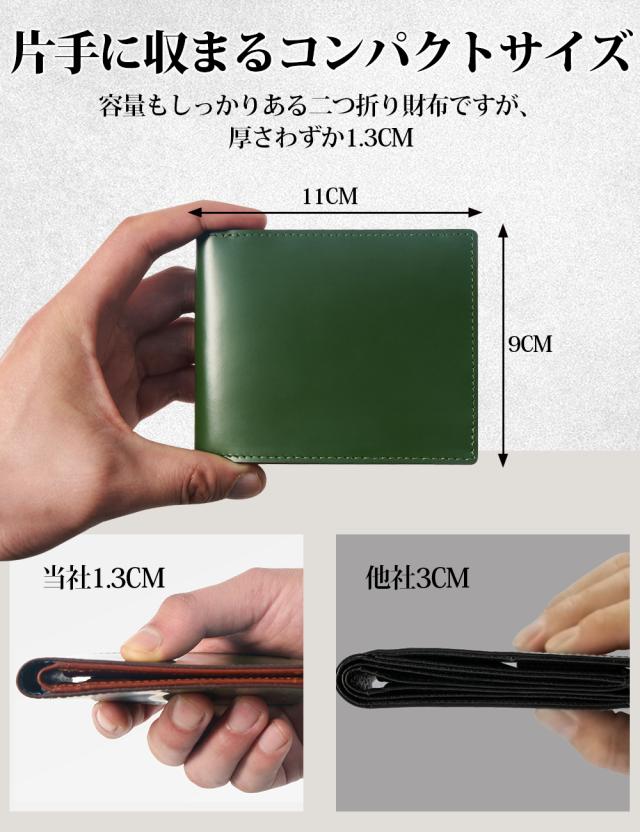 小銭入れポケットは大きく開くため、中身が一目でわかり、およそ30枚のコインを収納でき、会計の際にもスムーズに小銭を取り出すことができます。二つ折財布は深めのお札入れが2つ、お札や領収書を仕分けた収納も可能で取り出しやすくなっています。財布のカード入れも見開きと隠しポケットのデザインで、使用頻度によってカードの仕分けが可能です。