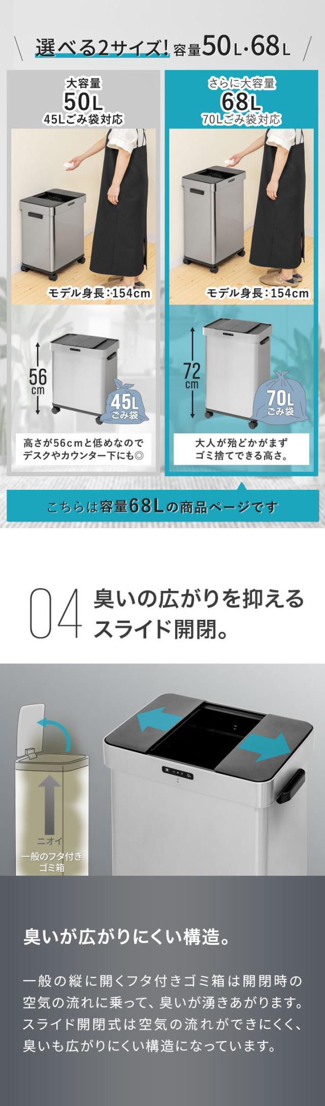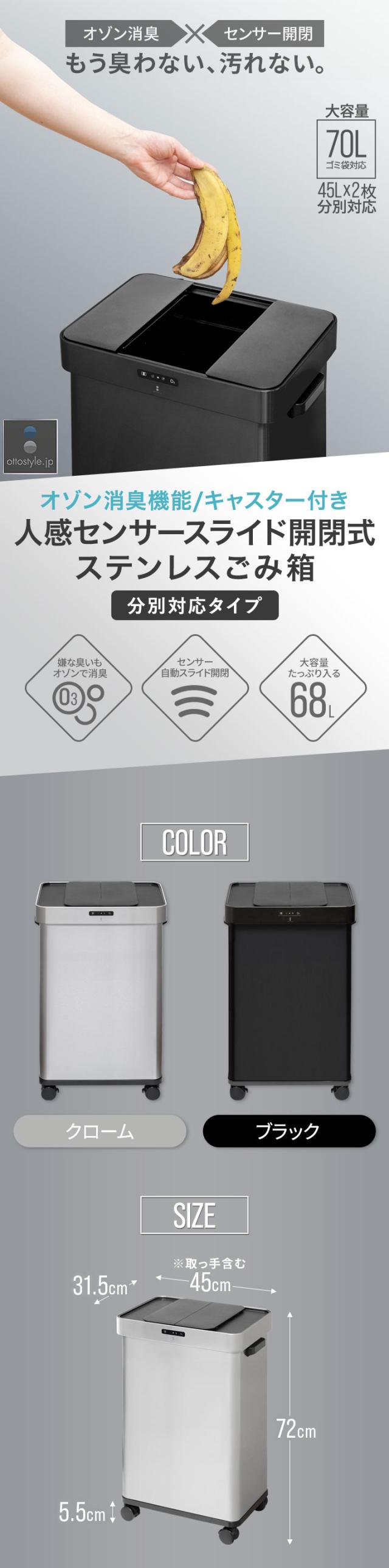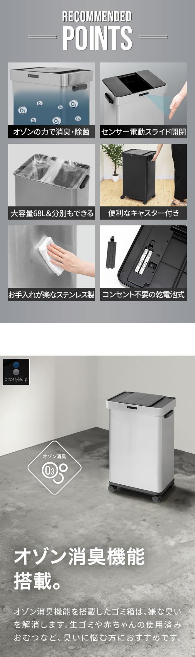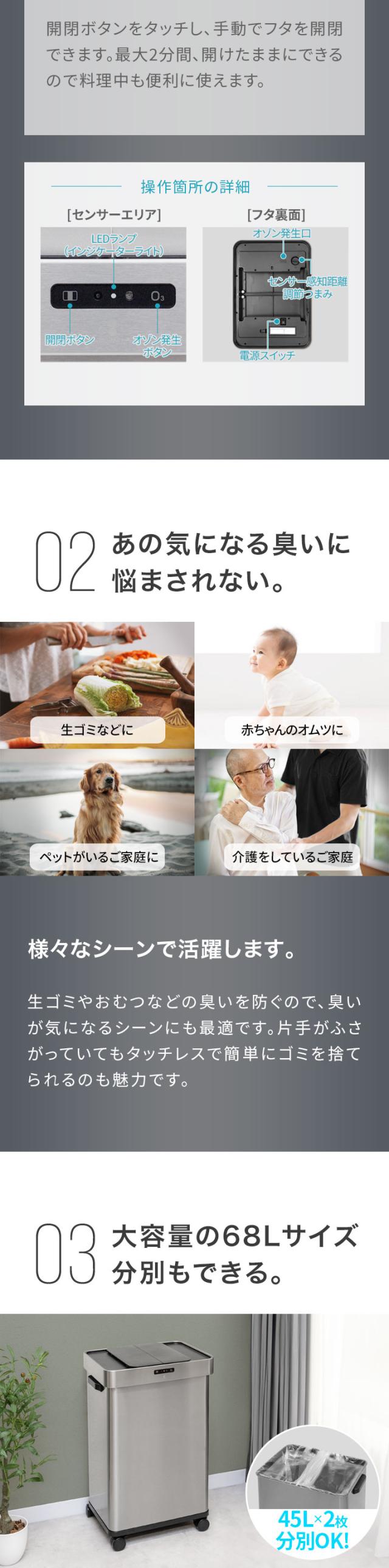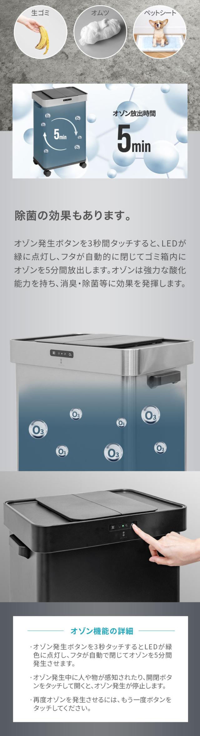 ゴミ箱 自動開閉 68L 臭わない 消臭 ふた付き 分別 70L 45L ゴミ袋対応 ごみ箱 ダストボックス 衛生 除菌 キッチン リビング スリム センサー キャスター 大容量 袋が見えない ステンレス オゾン 生ごみ おむつ 臭い シンプル 1年保証 送料無料