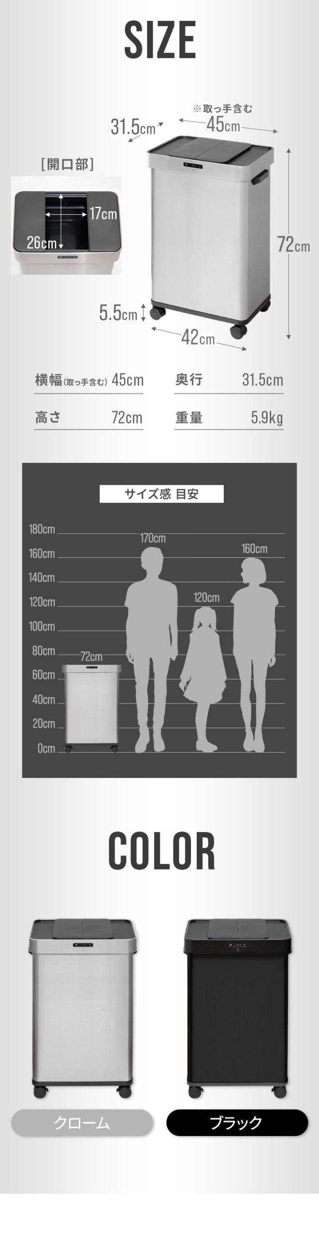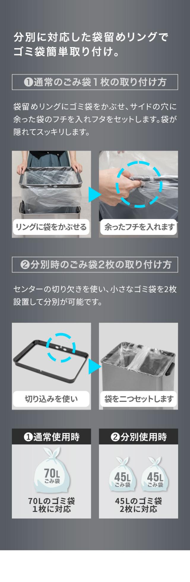 | 対応ゴミ袋サイズ: ・通常使用時 70リットル1枚 ・分別使用時 45リットル2枚 |