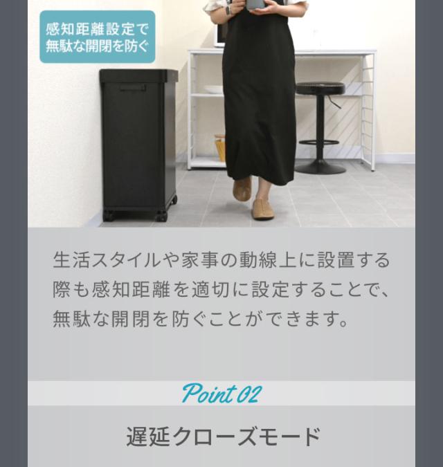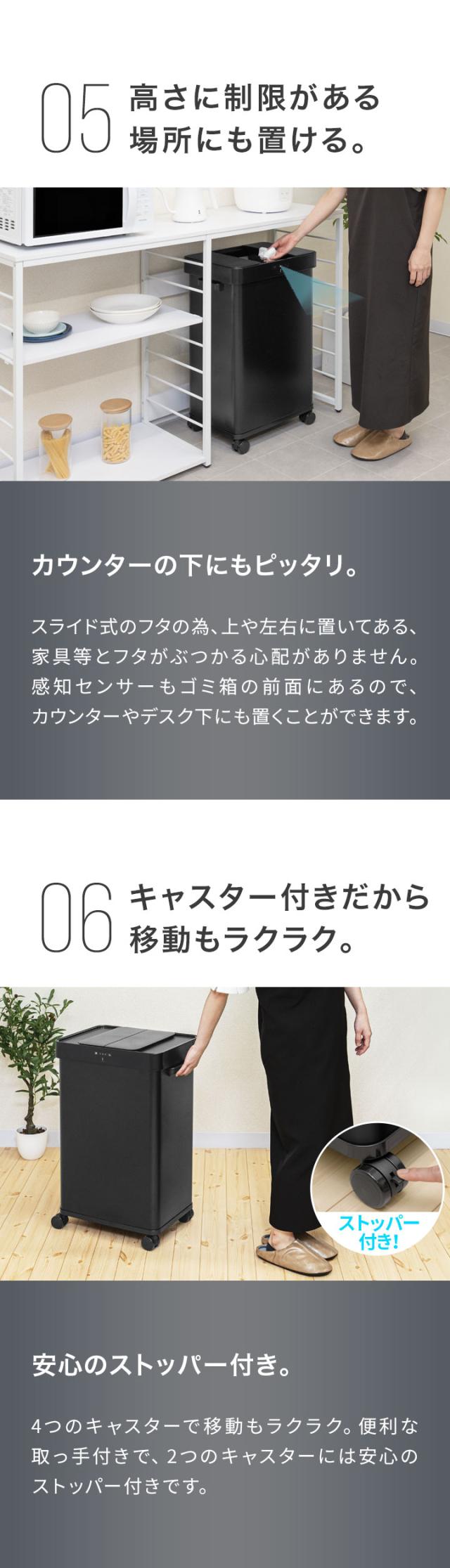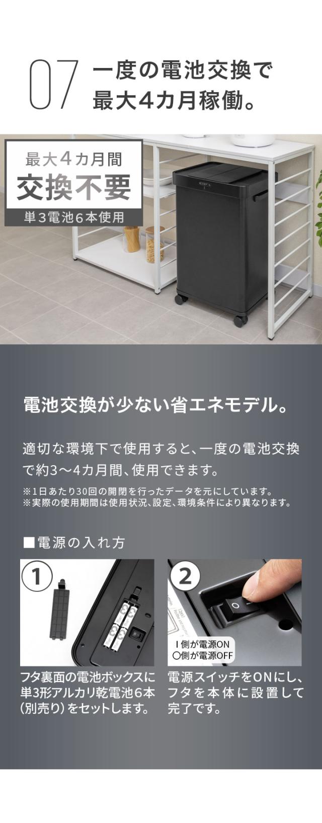 | 特記事項: ・キャスターのみお客様取り付けとなります。(組立時間目安は5分となります。) ・本商品に乾電池は付属しておりません。 ・電池は新品のアルカリ電池(日本メーカー)を使用し、新旧の電池を混ぜないようにご注意ください。 ・設置する場所や環境により誤動作したり、動作しない場合がございます。周りに干渉するような物が無い場所にて動作の確認を行ってください。 【動作についての注意】 開閉が遅くなったり、蓋が途中までしか開閉しない場合、電池の残量が少なくなっている可能性があります。 必ず全て新品のアルカリ電池に交換して動作確認を行ってください。 ※古い電池が混じっているとパワーが足りず動作に異常が出る可能性があります。 【蓋のお手入れについての注意】 さっと水拭きして頂くだけで簡単にお掃除ができますが、水を多く含んだ状態で水拭きを行うと蓋の隙間から水が浸入し破損の原因となります。 水拭きを行う際は固く絞り、水をよく切ってから行ってください。 【設置場所についての注意】 蓋に水がかかってしまうような場所には設置しないでください。 水が蓋に入り込んでしまうと破損の原因となります。 |