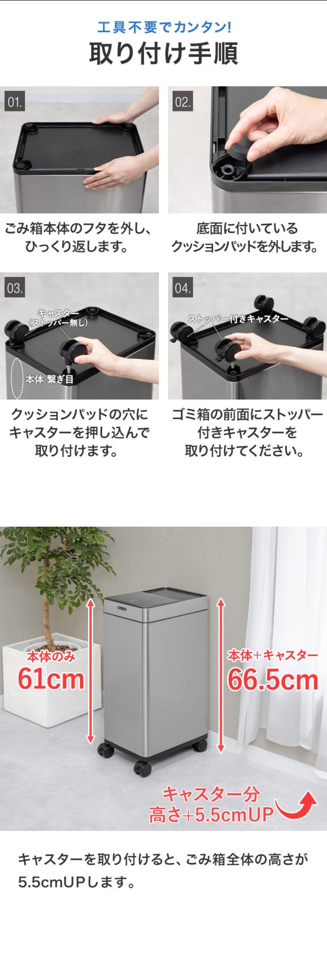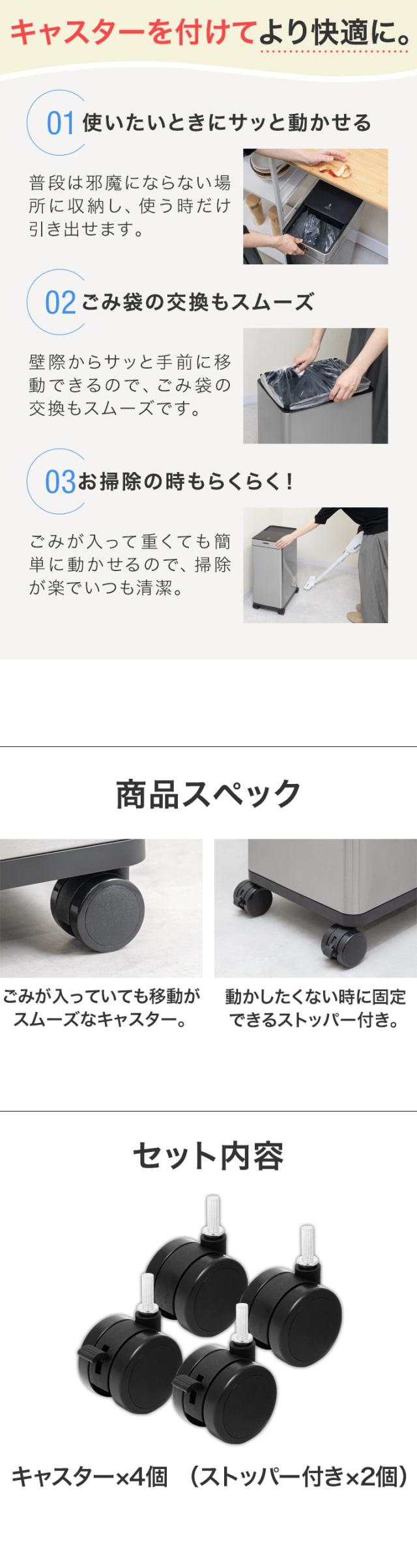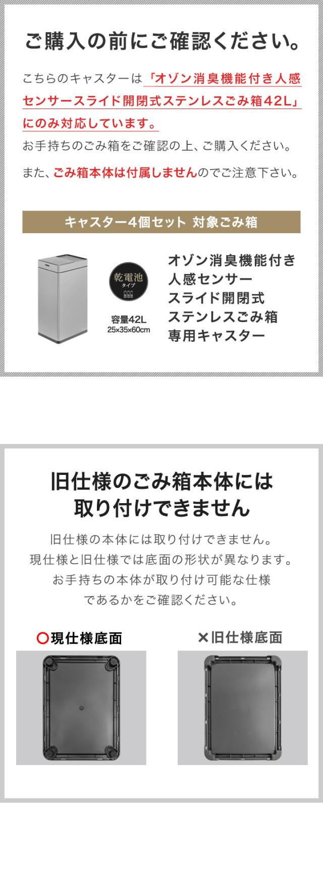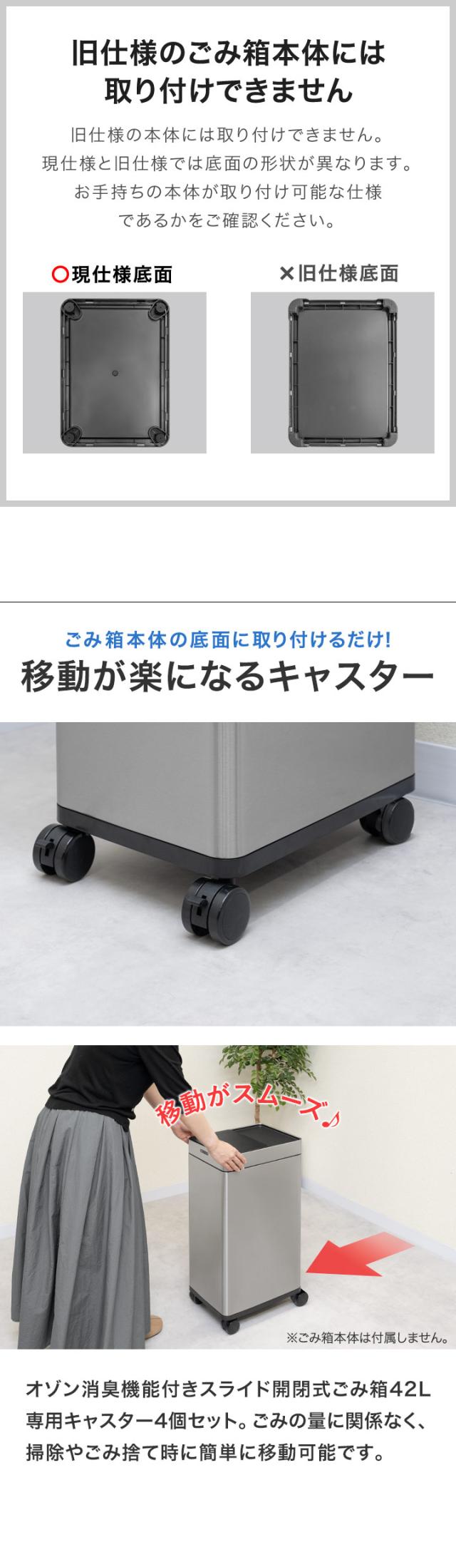 | 特記事項: ・こちらのキャスターは「オゾン消臭機能付き 人感センサースライド開閉式ステンレスごみ箱 容量 42L 現仕様タイプ」用となります。※旧仕様タイプには取り付けできませんのでのでご注意ください ・ごみ箱本体は付属いたしませんのでご注意ください。 |