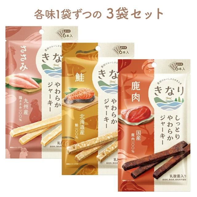 きなり しっとりやわらか ジャーキー 各味1袋 合計3袋 セット|ささみ 鮭 鹿肉 6本入/袋 アソート ペット おやつ 犬 少量 スティック 食べきりサイズ ジューシー 国産 やわらかい シニア犬 子犬 着色料 甘味料 香料 不使用 乳酸菌入り フード ペット用品