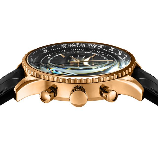 クロノグラフ60分計、1/5秒計、24時間表示を搭載し、足し算や速度、距離などの様々な計算を行える回転計算尺ベゼルが手元を知的にクラスアップします。