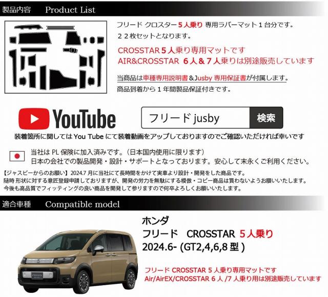 ・フリード CROSSTAR 5人乗り専用構成となっています。 AIR/AIR EX/CROSSTAR用 6人/7人乗りは別途販売していますのでご注意ください