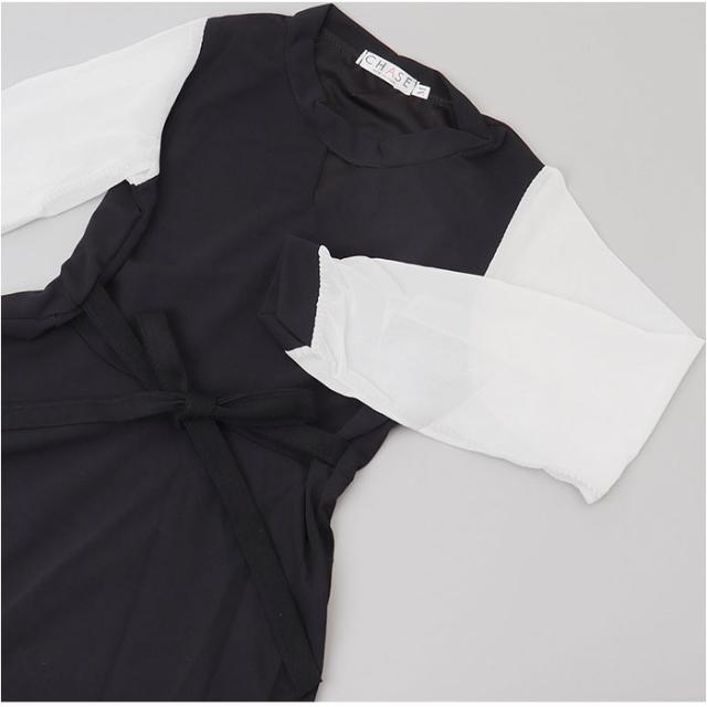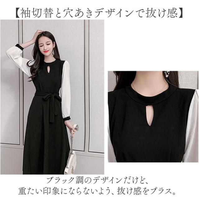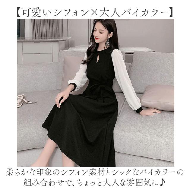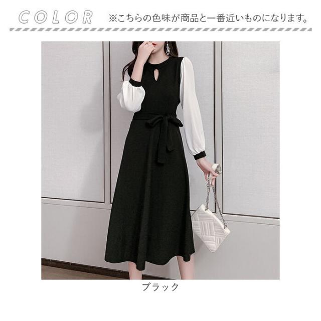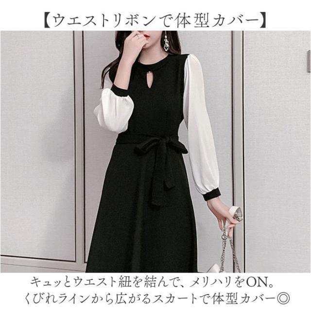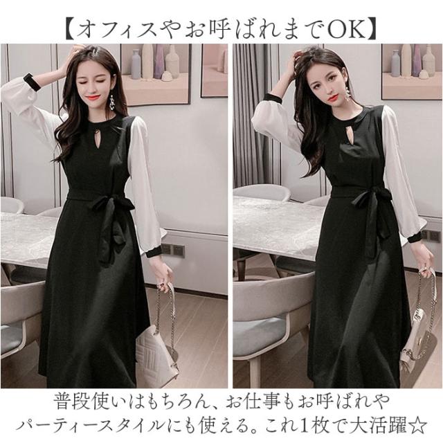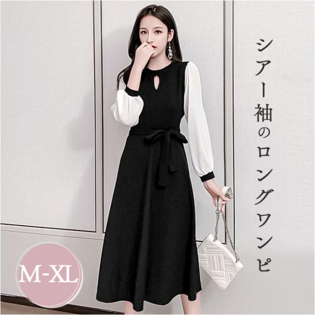 ワンピース レディース 通販 ロング ミディアム 長袖 ウエストマーク バイカラー きれいめ おしゃれ オシャレ ラウンドネック Aライン ワンピ ウエストリボン 膝下 上品 透け感