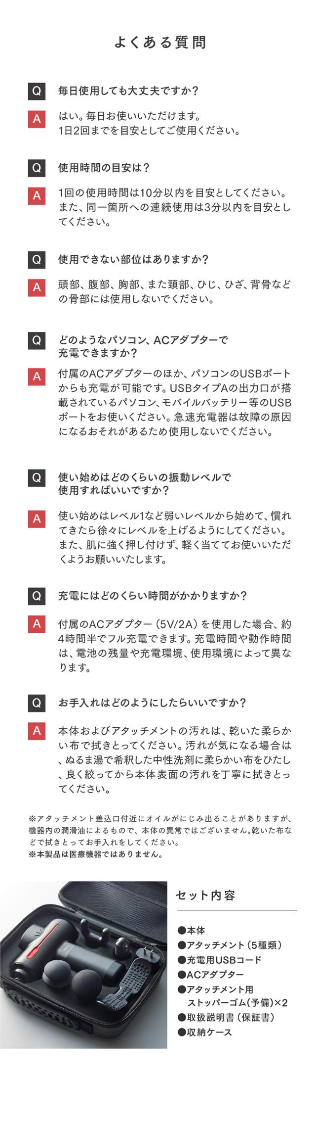 | ●パッケージ内容 | 本体×1・充電用USBコード×本・ACアダプター×1・アタッチメント×5・取扱説明書×1・収納ケース×1・アタッチメント用ストッパーゴム(予備)×2 |