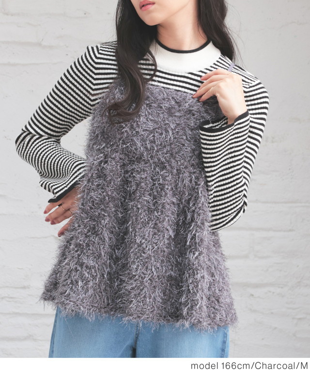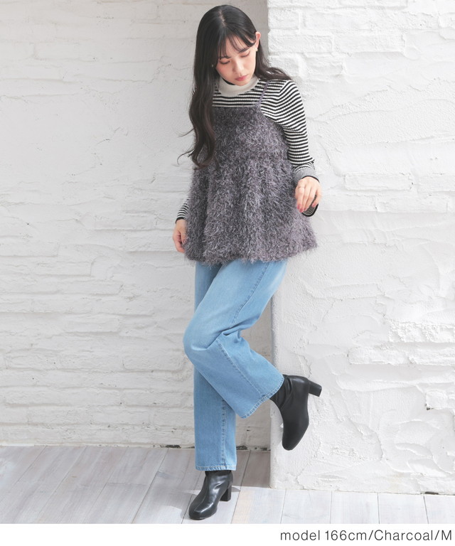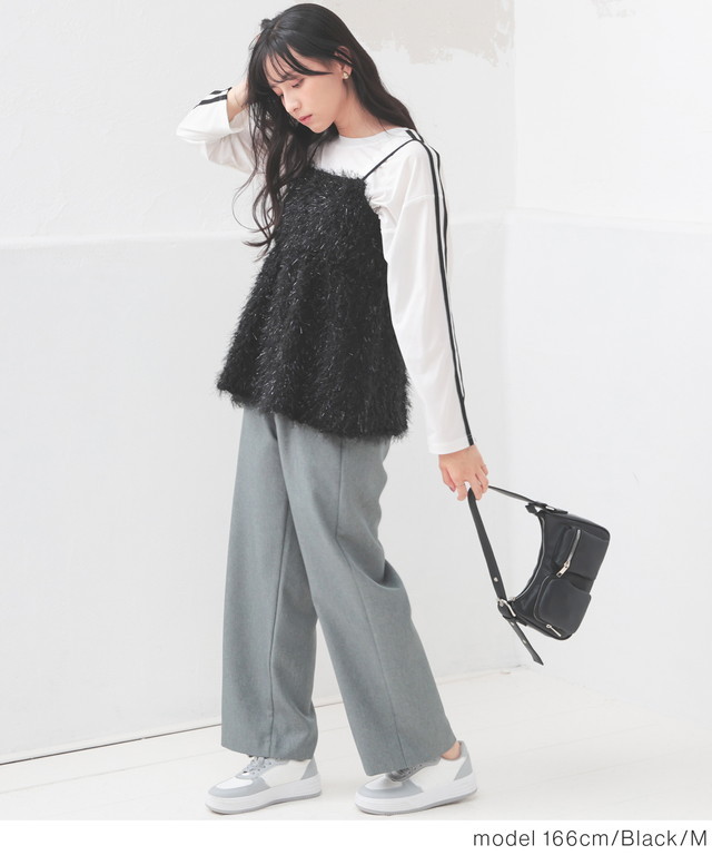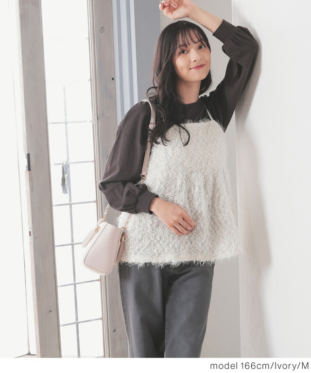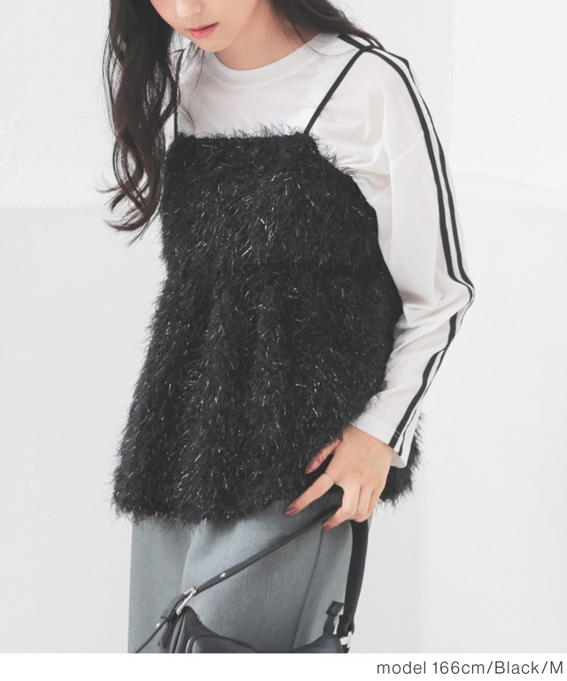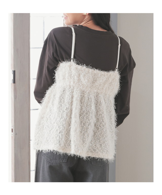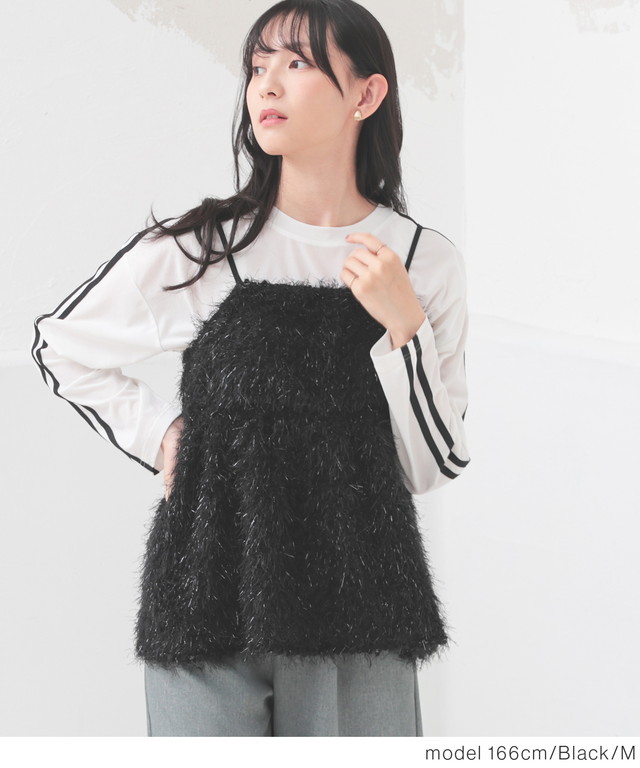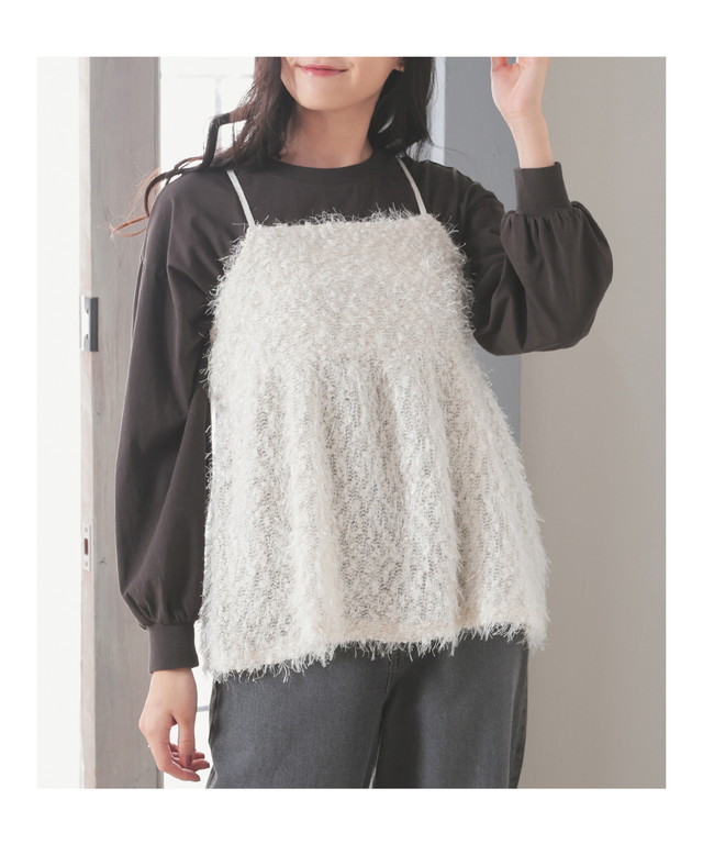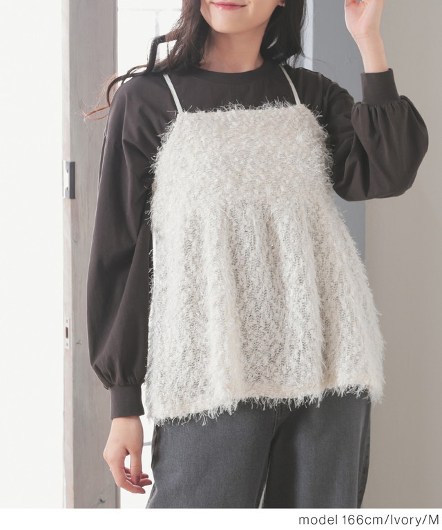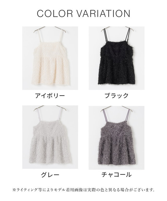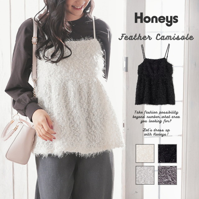 トップス キャミソール フェザー ギャザーふわふわ素材 体型カバー 肩紐調節可 レディース 雑誌掲載 Honeys ハニーズ フェザーキャミソール