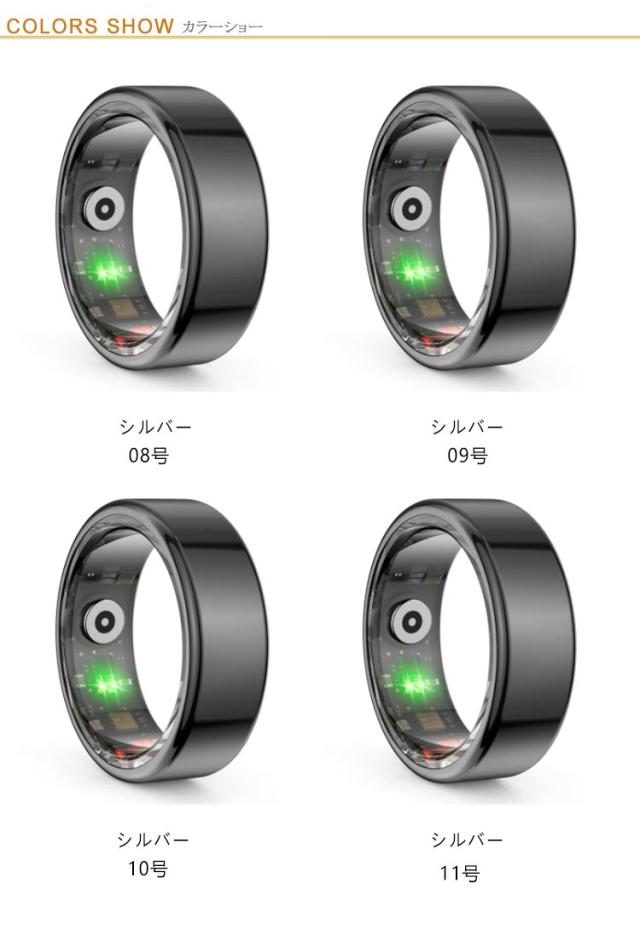 | サイズについての説明 | 08号(内周 56.9mm) 09号(内周 59.5mm) 10号(内周 62.1mm) 11号(内周 64.6mm) リング厚さ:約2.7mm 材質:Titanium alloy(チタン合金) 重さ:約4.46g(サイズによって変わります) 交換性:ios/android対応 Bluetooth範囲:5-10m バッテリー容量: 19mAh (通常使用約3-6日) 充電時間:約1時間 充電方法:マグネット充電ケーブル 防水レベル:IP68 主機能: ・アクティビティログ:距離/消費カロリー/ステップ数 ・スポーツモード:20種類 ・睡眠測定:睡眠時間/睡眠分析 |