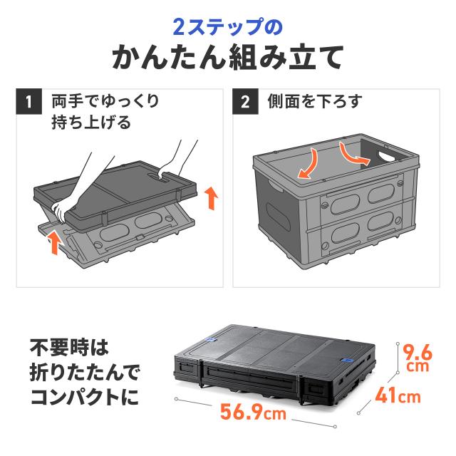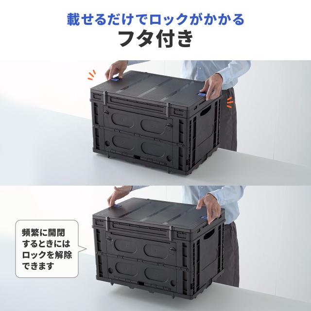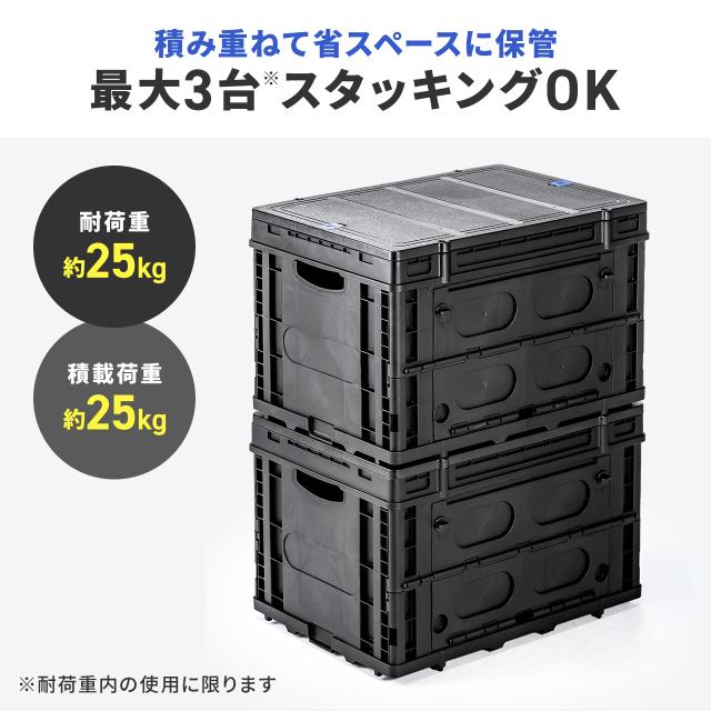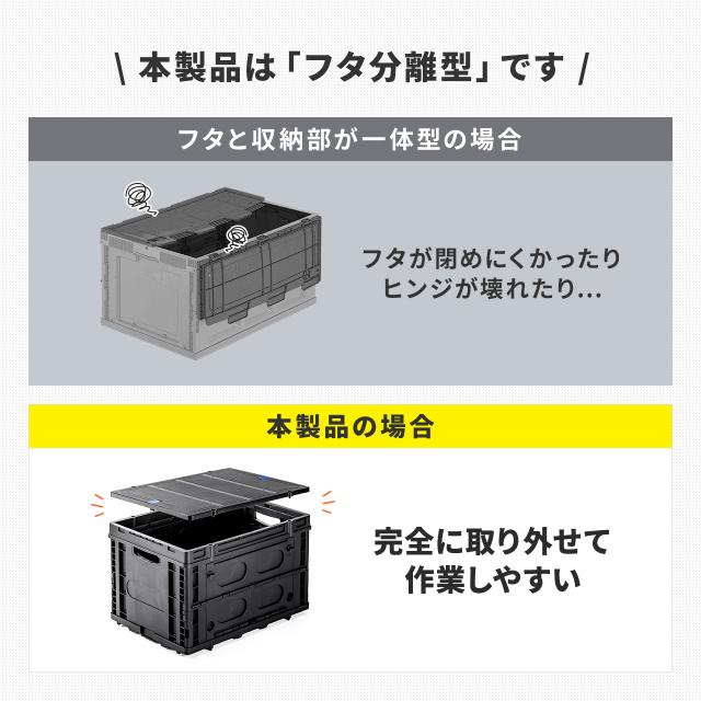 折りたたみコンテナ 容量65L 耐荷重25kg サイドオープン 取り外せるフタ付き スタッキング 荷物収納 保管 防災 アウトドア ブラック[100-CNT001CV]