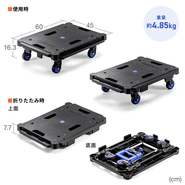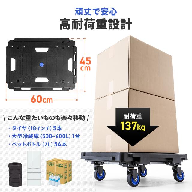 ●キャスターを格納できて耐荷重137kgまでに対応した平台車です。●荷物の大きさに合わせて縦・横に連結することができます。