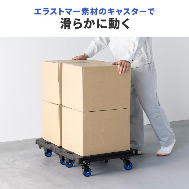⇒ご購入の前にご確認下さいキャスターを格納できる平台車。約137kgの高耐荷重設計で安心。縦・横に連結をして拡張が可能、6つ連結してパレットサイズにも使える。積み重ね(スタッキング)して、省スペースでの収納も可能。滑らかに動くエラストマーキャスターを搭載。ブラック。【WEB限定商品】