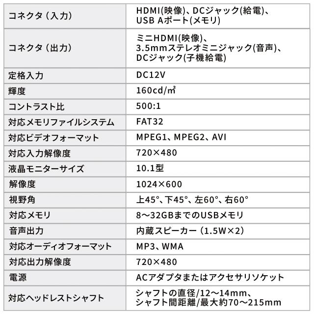 ●車のヘッドレストに取り付けて後部座席で映像やゲームを楽しめるヘッドレストモニターです。●10.1インチの液晶で、DVDの再生やUSBメモリにコピーした動画、音楽、画像データの再生が可能です。