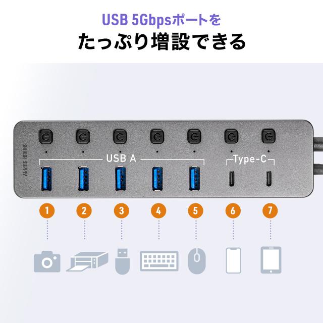 ⇒ご購入の前にご確認下さい7つのUSBポートすべてにスイッチが付いたセルフパワーのUSBハブ。USB A×5・type-C×2ポートの増設が可能。すべてのポートでUSB 5Gbpsの高速通信と充電が可能。【WEB限定商品】