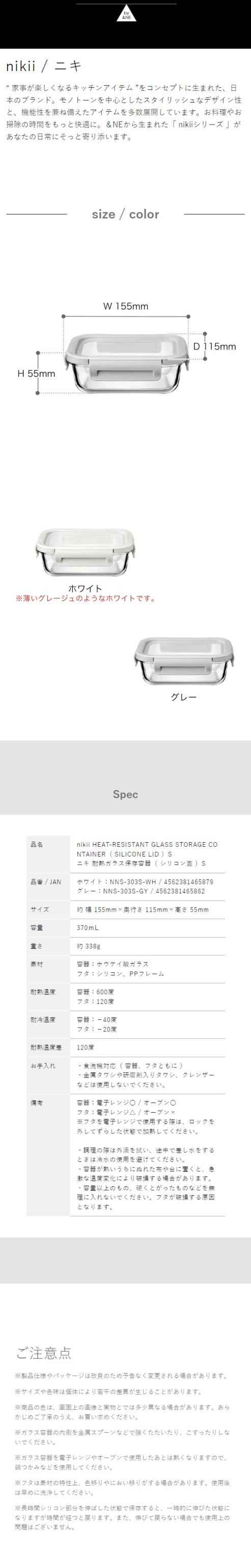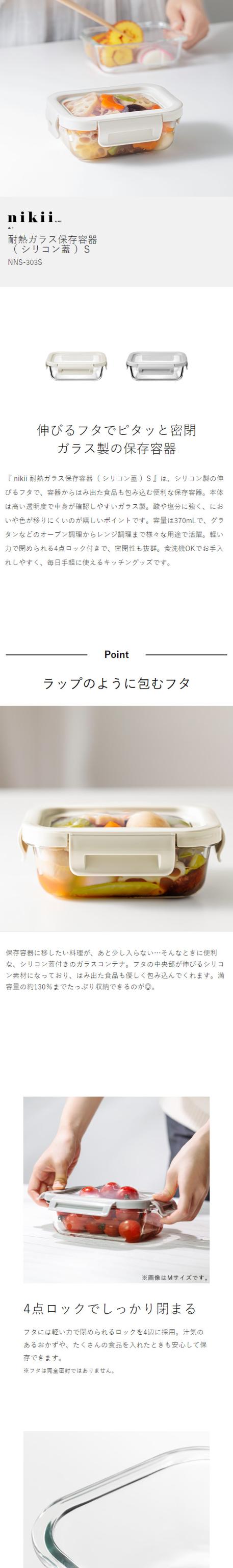 [ nikii 耐熱ガラス保存容器(シリコン蓋)S ]保存容器 タッパー フードコンテナ 耐熱ガラス シリコン蓋 伸びる蓋 電子レンジ オーブン 食洗機 370mL Sサイズ コンパクト 一人暮らし 新生活 シンプル &NE アンドエヌイー ニキ NNS-303S