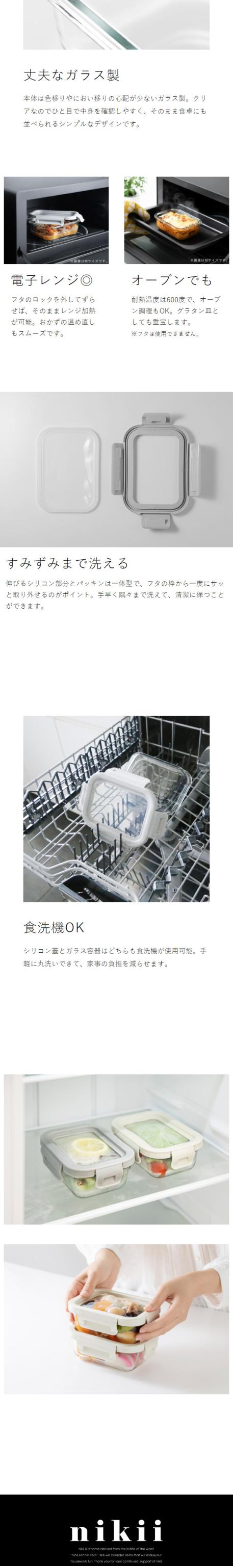 伸びるフタでピタッと密閉 ガラス製の保存容器 『 nikii 耐熱ガラス保存容器( シリコン蓋 )S 』は、シリコン製の伸びるフタで、容器からはみ出た食品も包み込む便利な保存容器。本体は高い透明度で中身が確認しやすいガラス製。酸や塩分に強く、においや色が移りにくいのが嬉しいポイントです。容量は370mLで、グラタンなどのオーブン調理からレンジ調理まで様々な用途で活躍。軽い力で閉められる4点ロック付きで、密閉性も抜群。食洗機OKでお手入れしやすく、毎日手軽に使えるキッチングッズです。