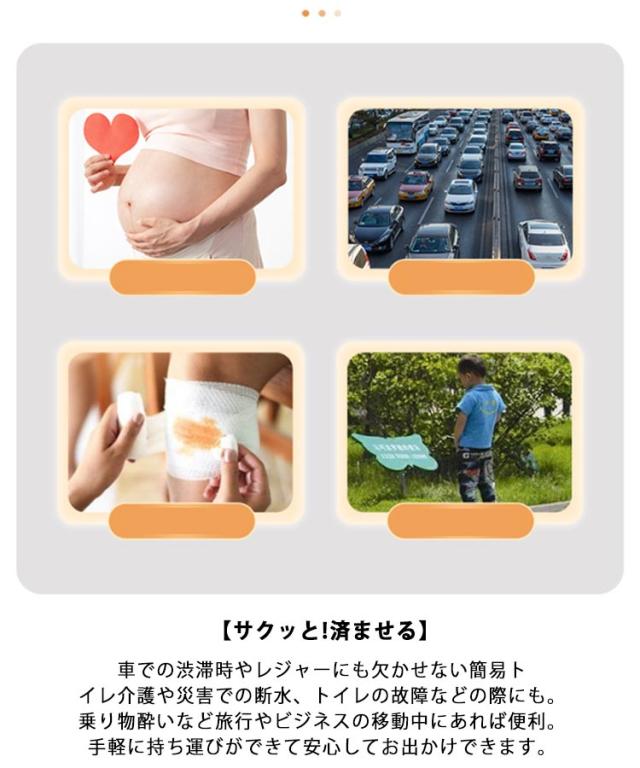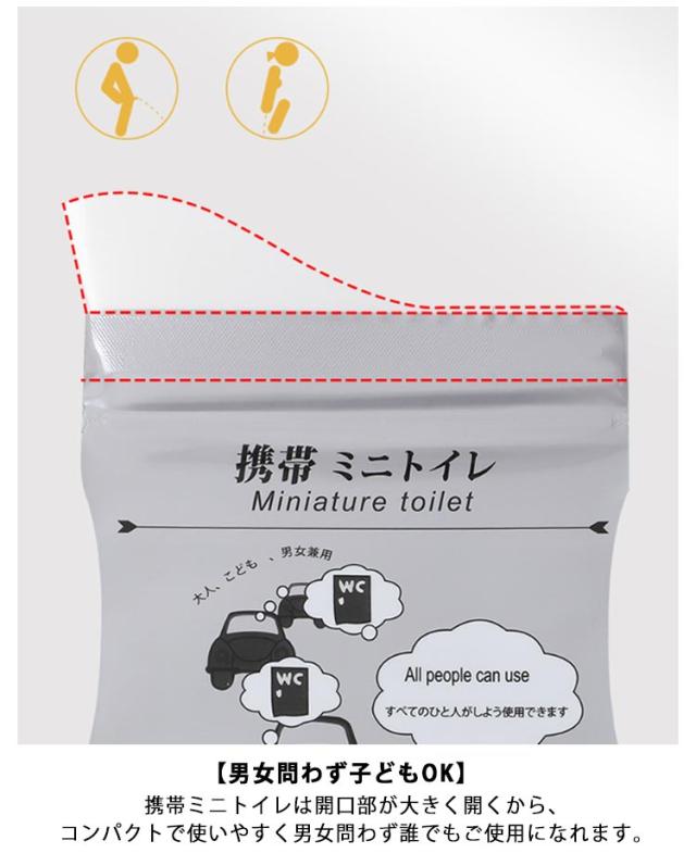 | おしっこを固めて、においを消す!700mlたっぷり吸収!携帯ミニトイレ10枚セット 【緊急時に便利な携帯タイプ】:柔らかい素材を採用し、吸水シートタイプで、汚物袋も透けないので快適に衛生的に利用できます。 【700mlの吸収力・安全安心】:吸水性抜群!一般的な成人の排尿量は200~400mIですので最大700mlを吸水してくれる本商品は安心設計です。 【男女問わず子どもOK】:携帯ミニトイレは開口部が大きく開くから、コンパクトで使いやすく男女問わず誰でもご使用になれます。 【コンパクトで持ち運びに便利】:片手で使用可能。ワンタッチで簡単に使用できま・コンパクトで便利!余ったスペースに収納できます。 【消臭力、抗菌に優れて安心】:ポリエチレンと吸水ポリマーを使用する赤ちゃん用のおむつのような吸収シートを採用し、素早くゲル状に排泄物を固めて匂いも抑えられて、消臭力、抗菌に優れて、安心できます。 【密閉型デザイン】携帯ミニトイレをご使用後、袋のジッパーをしっかり閉める。すぐ捨てることができなくても臭わず快適!菌も漏らさず衛生的です。 【サクッと!済ませる】:車での渋滞時やレジャーにも欠かせない簡易トイレ介護や災害での断水、トイレの故障などの際にも。乗り物酔いなど旅行やビジネスの移動中にあれば便利。手軽に持ち運びができて安心してお出かけできます。 | |