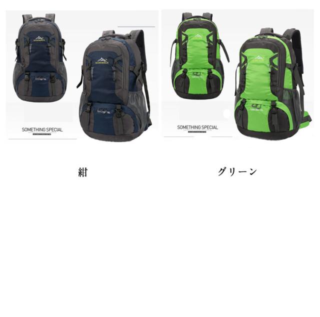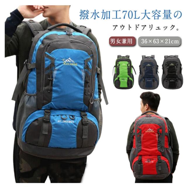 | 撥水加工70L大容量のアウトドアリュック。 ポケットがたくさんあり、衣類・靴及び他のお出かけ用品を収納でき、登山や旅行に最適。 背中部分はメッシュ素材を使用しており、滑りにくく背負う過程で肩に発生する空滑り現象を防止します。 ワイドショルダー+ストレスパッド+胸(腰)固定ベルトで背負いやすくなります。 アウトドアや登山、旅行用だけでなく、通勤通学などにも使える大容量リュックです! | |