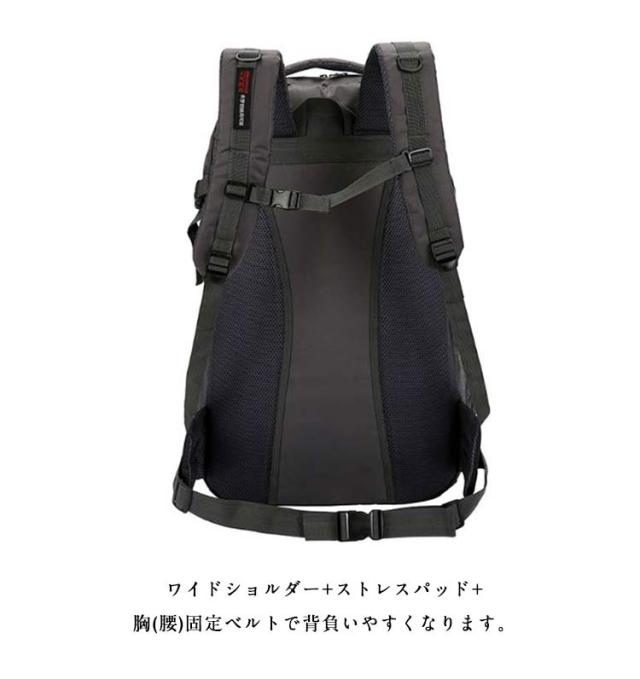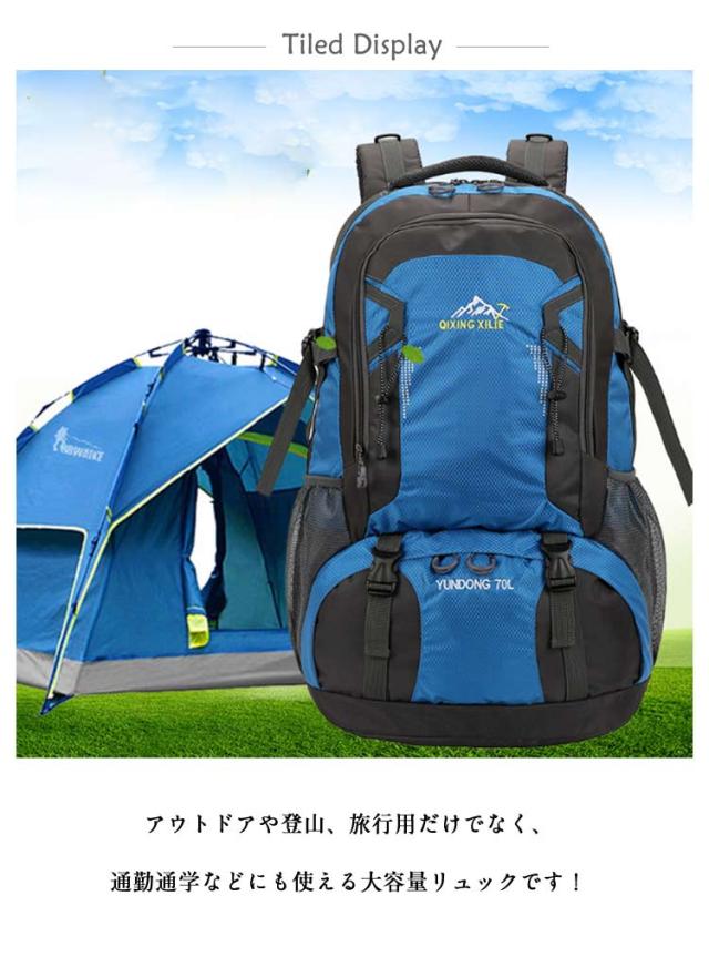 | 撥水加工70L大容量のアウトドアリュック。 ポケットがたくさんあり、衣類・靴及び他のお出かけ用品を収納でき、登山や旅行に最適。 背中部分はメッシュ素材を使用しており、滑りにくく背負う過程で肩に発生する空滑り現象を防止します。 ワイドショルダー+ストレスパッド+胸(腰)固定ベルトで背負いやすくなります。 アウトドアや登山、旅行用だけでなく、通勤通学などにも使える大容量リュックです! | |