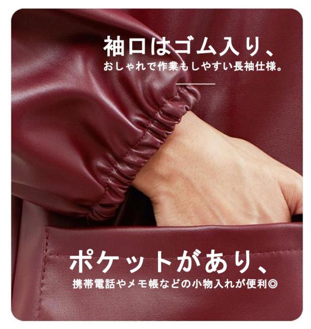 | 長めの着丈でゆったりと着られる、前開きデザインのエプロン 家事の時の下に着ている洋服を汚れからしっかりガード◎ 便利なファスナーデザイン、着脱がスムーズに♪ お手入れ簡単のレザー生地、水仕事にも便利。 袖口はゴム入り、おしゃれで作業もしやすい長袖仕様。 ポケットがあり、携帯電話やメモ帳などの小物入れが便利◎ お料理・ガーデニング・DIY・作業・料理教室・陶芸・絵画絵画など、仕事現場のユニフォームに最適です。 | |