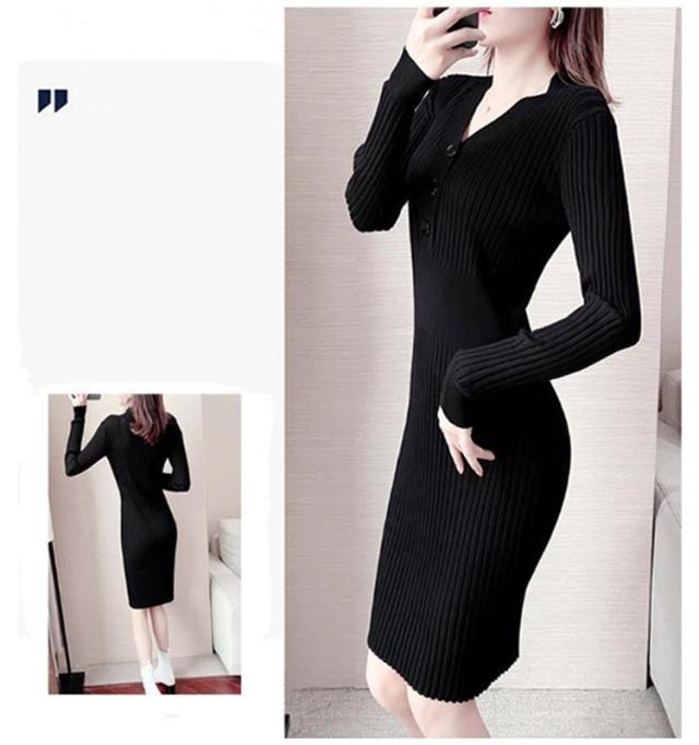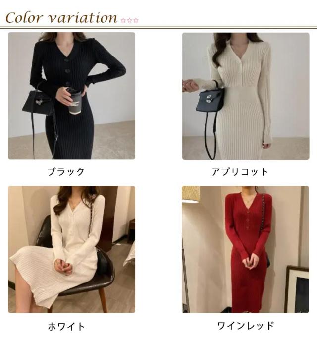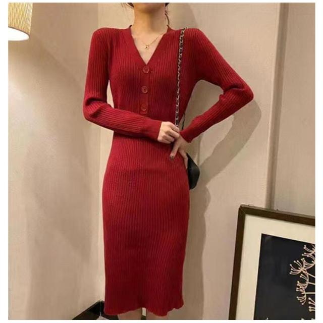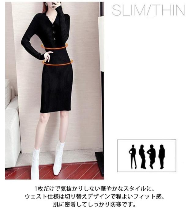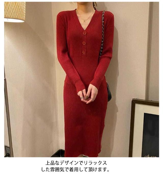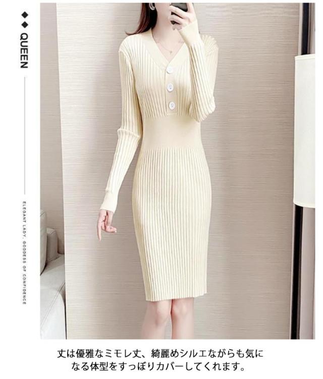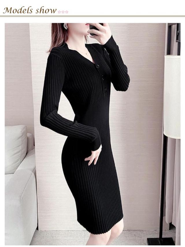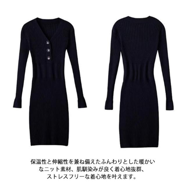 無地 タイト ニットワンピース ワンピース レディース 秋冬 通学 セーター シンプル 着?せ Vネック 大人 女性 きれいめ ロング 可愛い リブニット ボタン ミモレ丈 フェミニン 韓国 切り替え 秋冬 かわいい 通勤 タイト ギフト