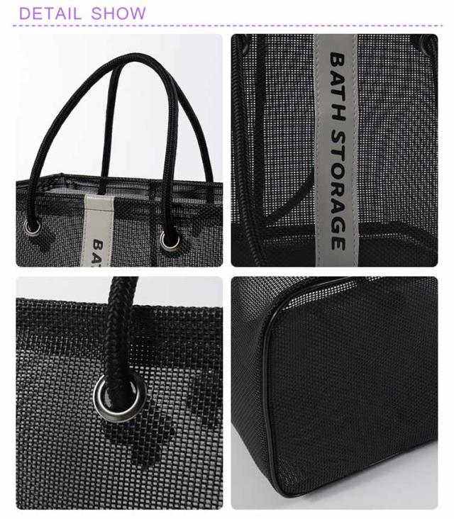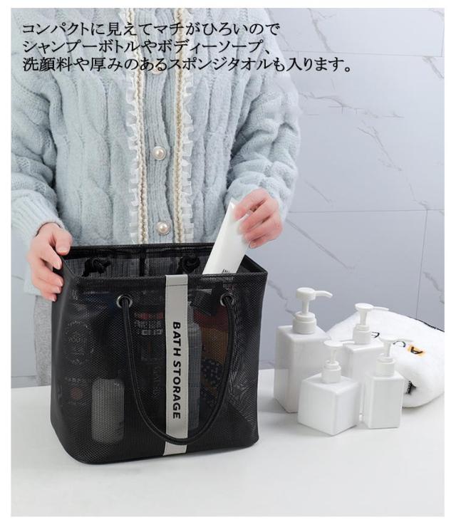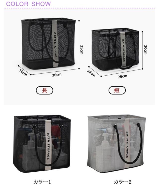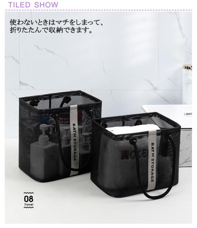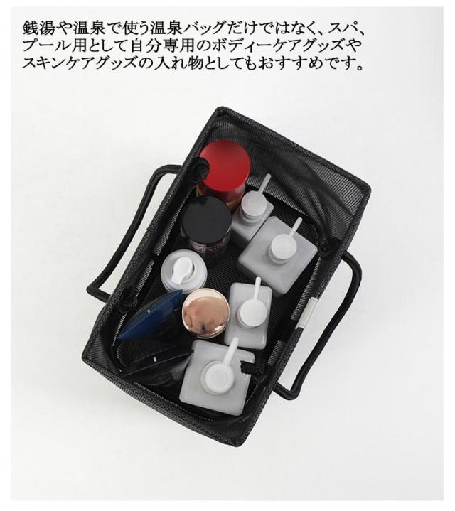 | 水切りデザイン、濡れた小物を入れても通気性が良い入浴/プール/温泉に欠かせないメッシュお風呂バッグ。 使わないときはマチをしまって、折りたたんで収納できます。 コンパクトに見えてマチがひろいのでシャンプーボトルやボディーソープ、洗顔料や厚みのあるスポンジタオルも入ります。 銭湯や温泉で使う温泉バッグだけではなく、スパ、プール用として自分専用のボディーケアグッズやスキンケアグッズの入れ物としてもおすすめです。 全2色カラーでシンプルなデザインなので、男女兼用でご使用いただけます。 | |
